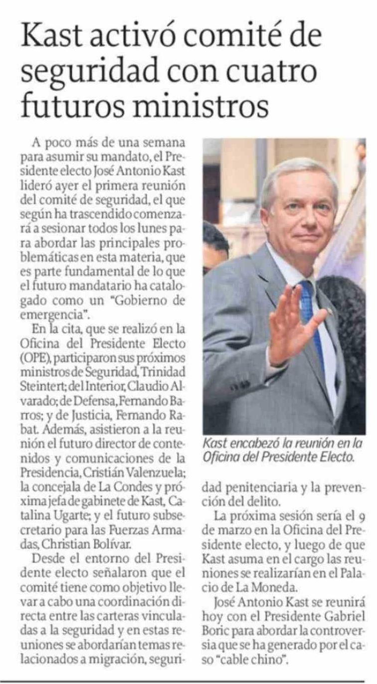 Título: Kast activó comité de seguridad con cuatro futuros ministros