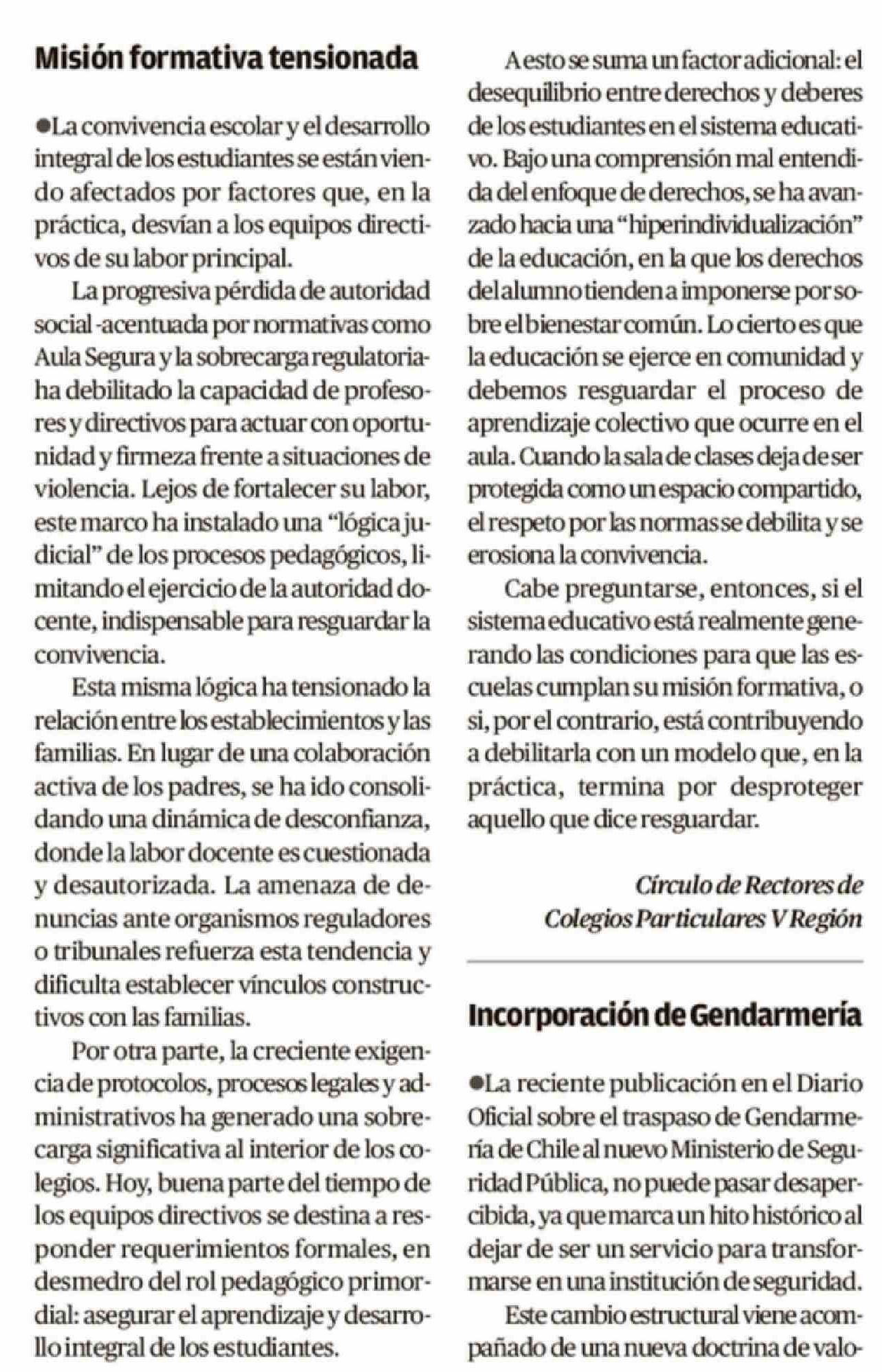 CARTAS: Misión formativa tensionada 19-04-2026 El Mercurio de Valparaíso |