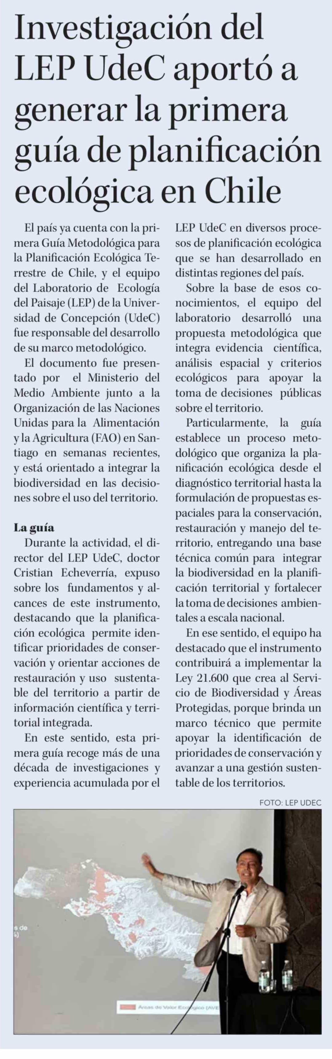 Investigación del LEP UdeC aportó a generar la primera guía de planificación ecológica en Chile 28-03-2026 Diario Concepción |