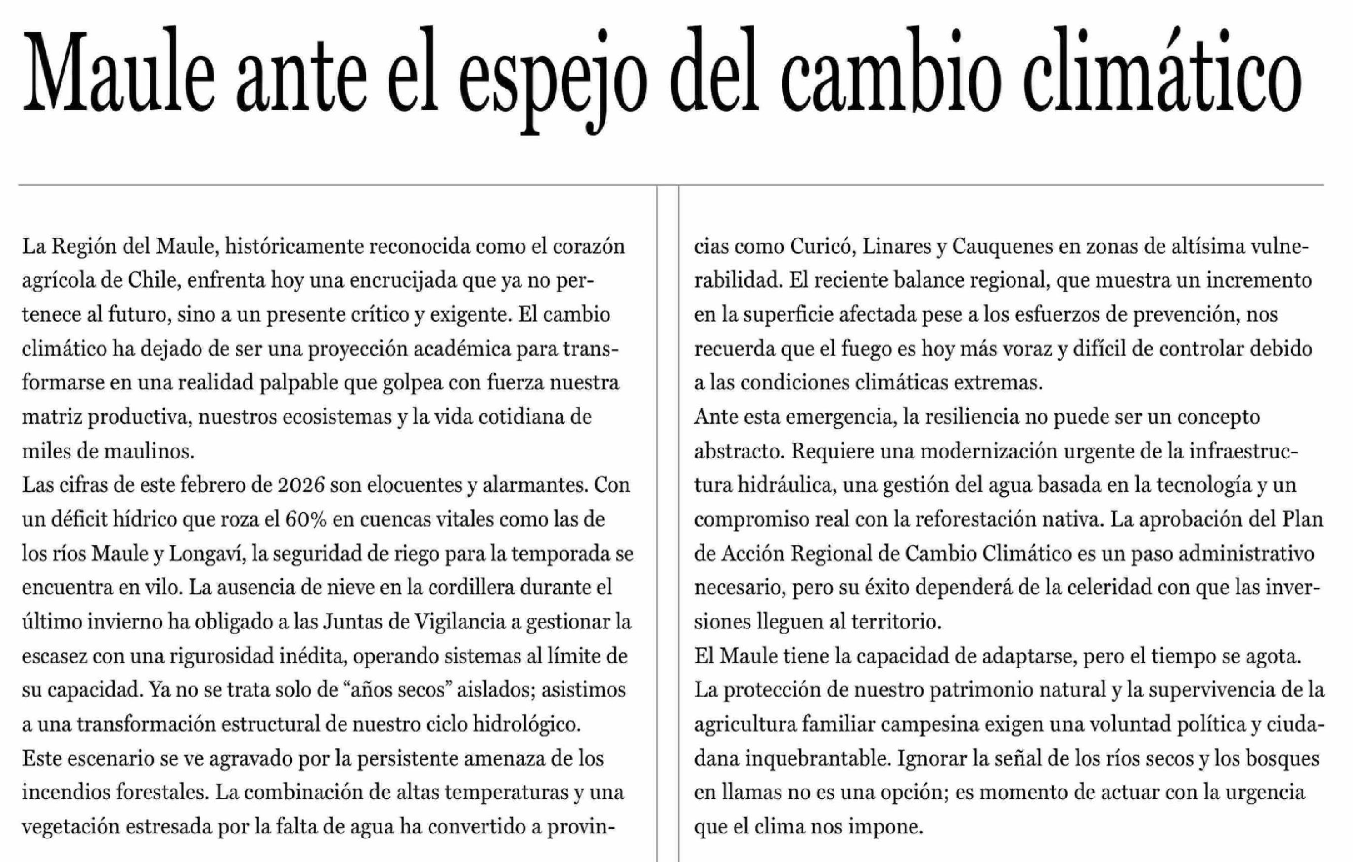 Editorial: Maule ante el espejo del cambio climático 23-02-2026 La Prensa de Curicó |