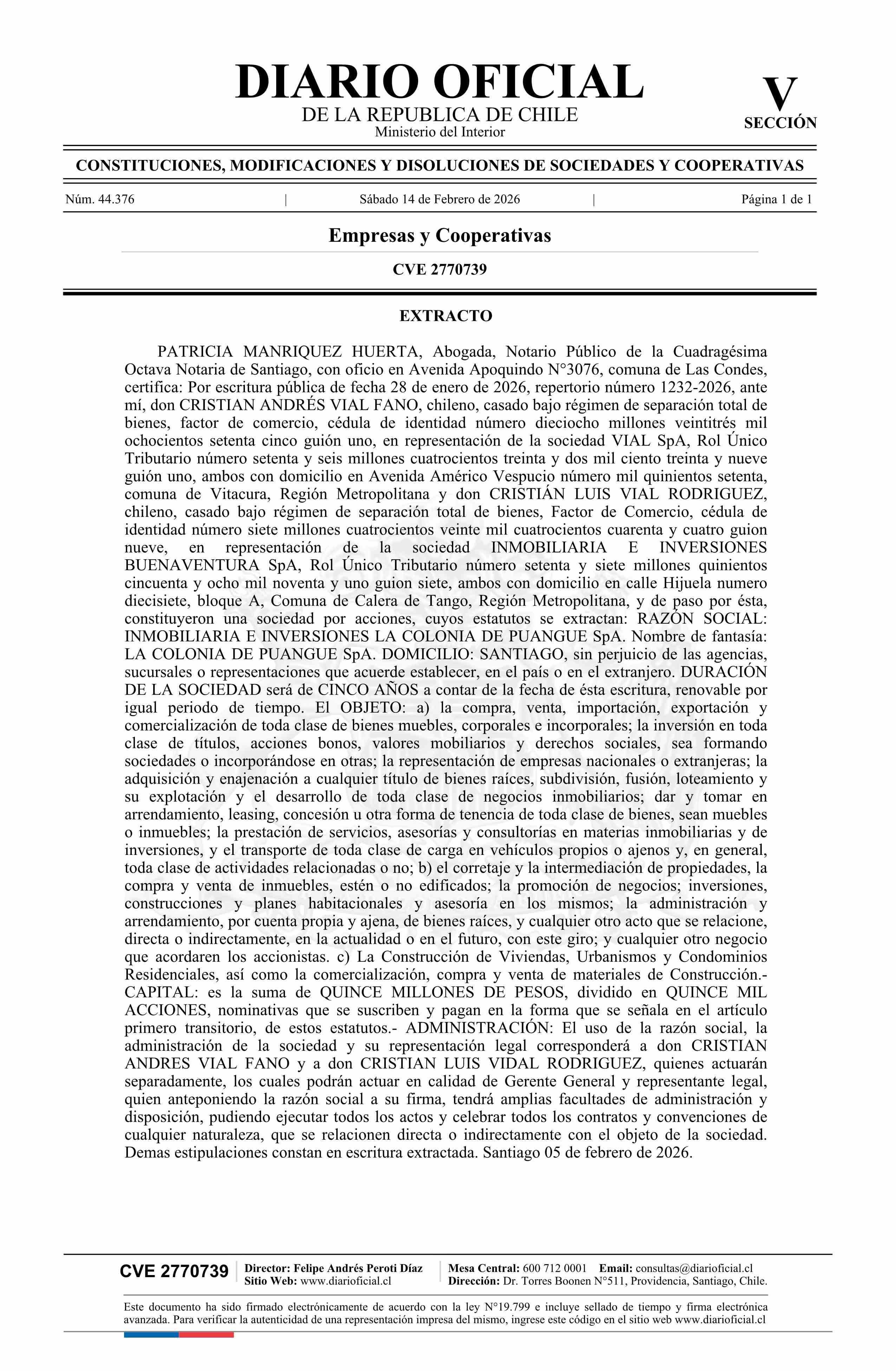 Título: INMOBILIARIA E INVERSIONES LA COLONIA DE PUANGUE SpA