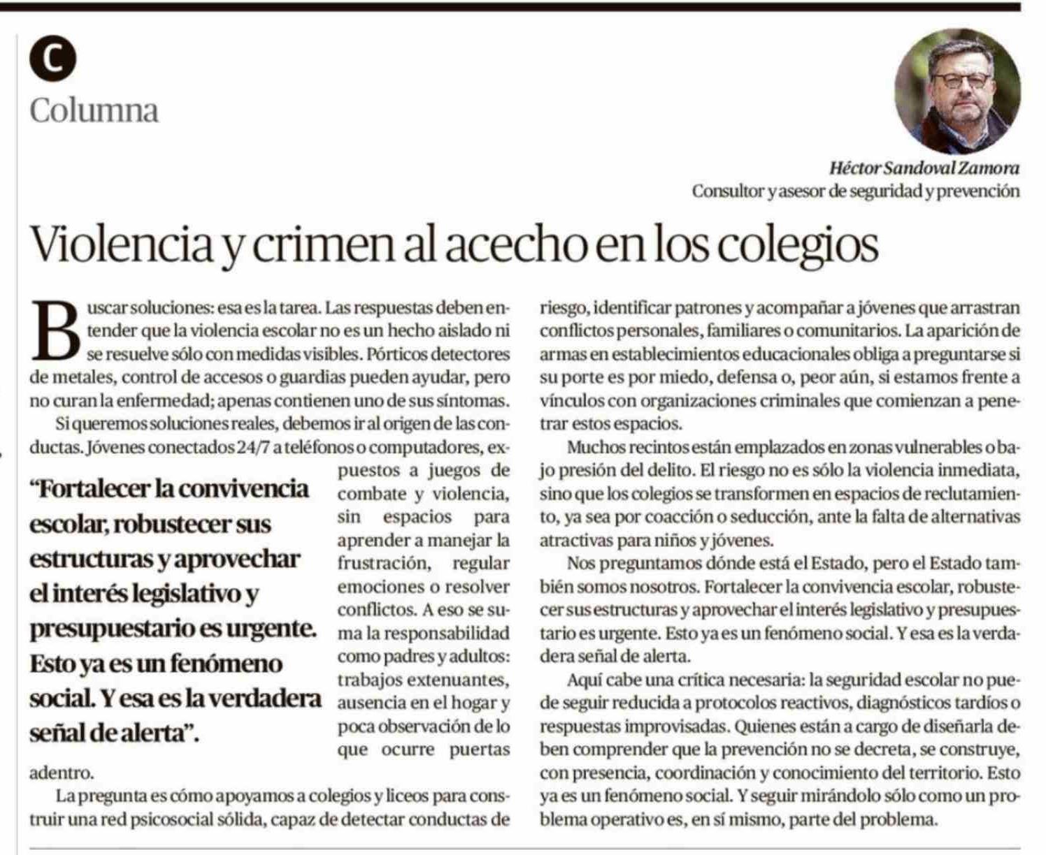 Columnas de Opinión: Violencia y crimen al acecho en los colegios 13-04-2026 El Mercurio de Valparaíso |