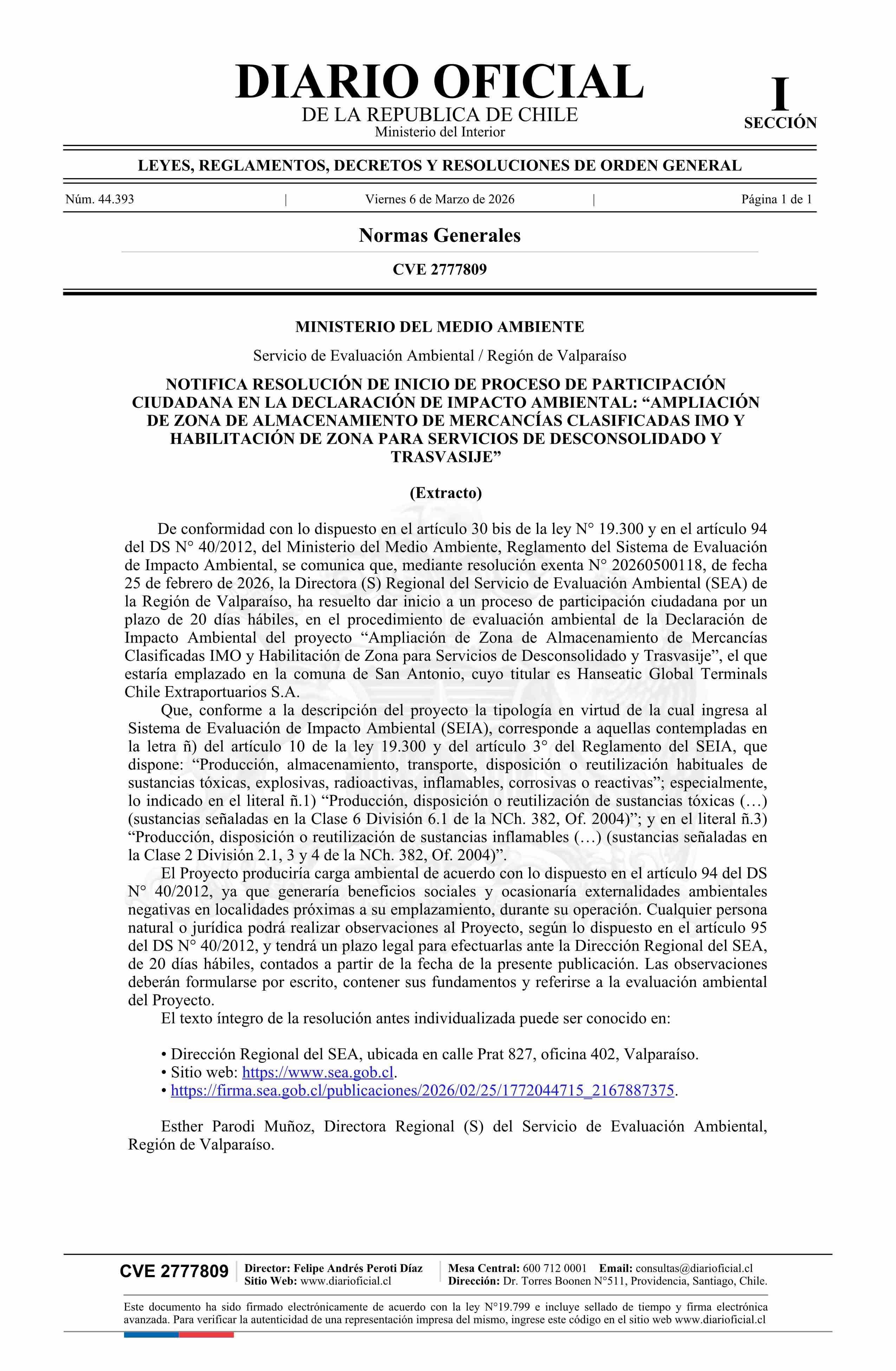 Título: Extracto de resolución exenta número 20260500118, de 2026.- Inicia proceso de participación ciudadana en la Declaración de Impacto Ambiental del proyecto Ampliación de zona de almacenamiento de mercancías clasificadas IMO y habilitación de zona para servicios de desconsolidado y trasvasije