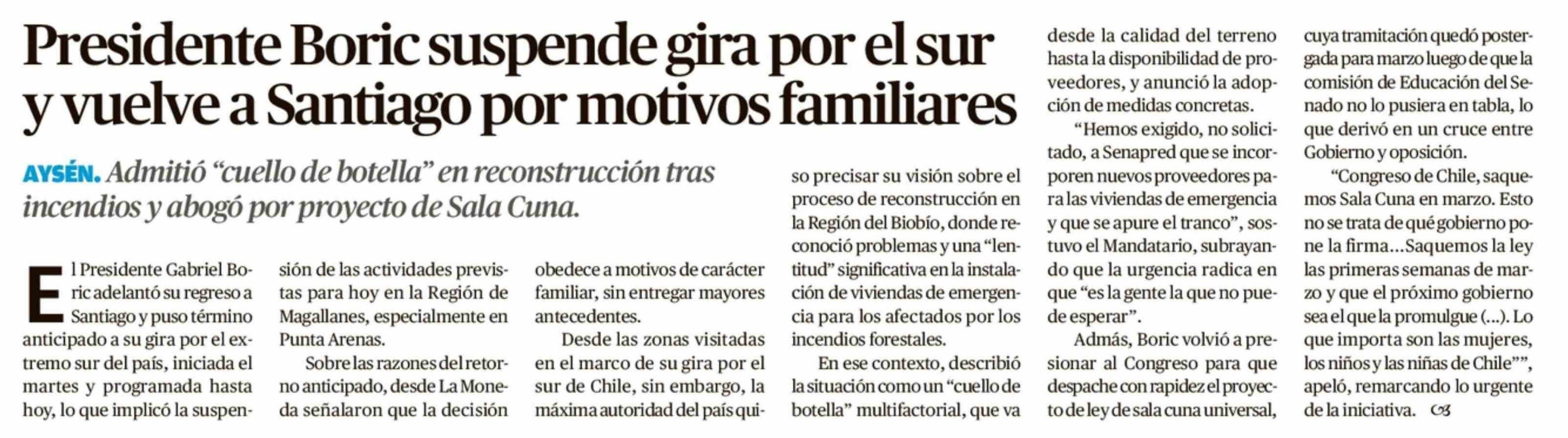 | Título: | Presidente Boric suspende gira por el sur y vuelve a Santiago por motivos familiares |