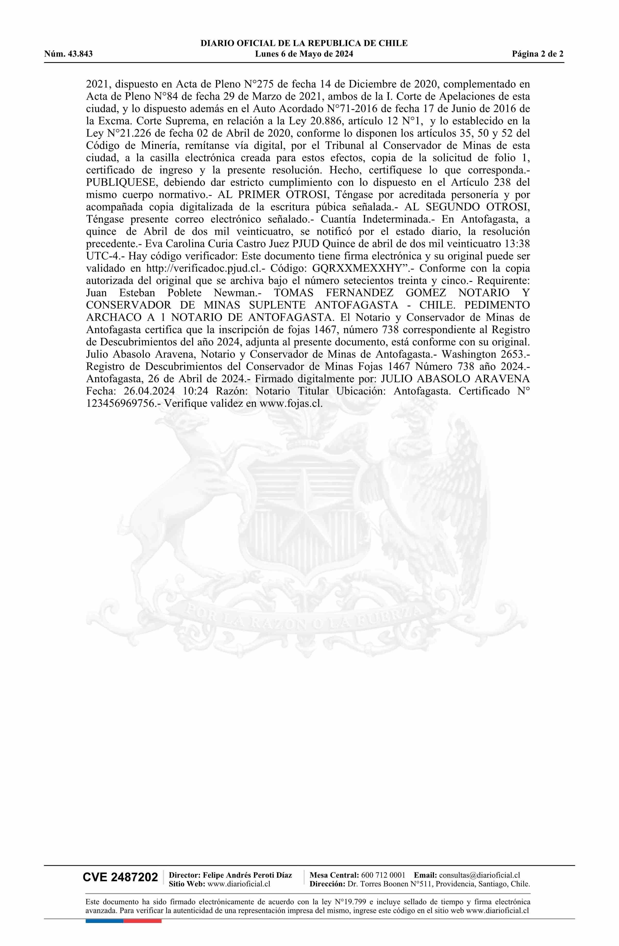ARCHACO A 1 / Antofagasta Minerals S.A. 06-05-2024 DIARIO OFICIAL CHILE - BOLETÍN OFICIAL DE MINERÍA |