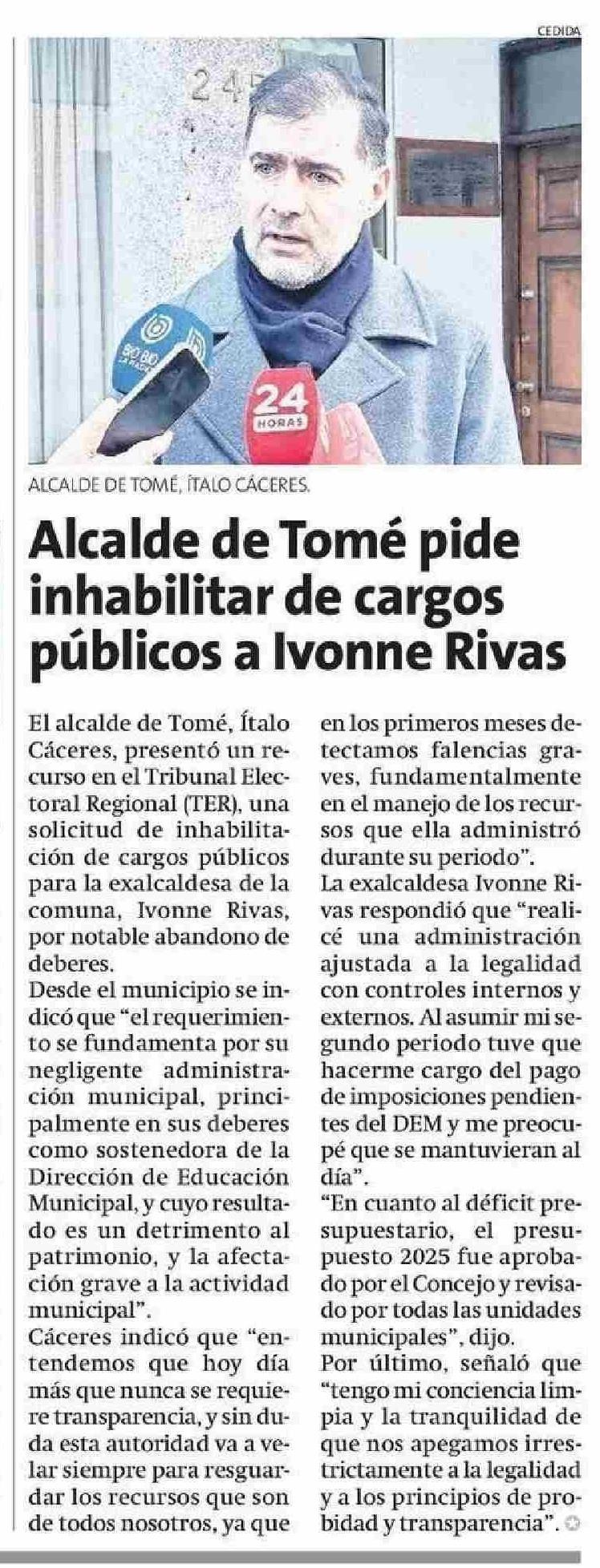 Alcalde de Tomé pide públicos a Ivonne Rivas inhabilitar de cargos 06-06-2025 La Estrella de Concepción |