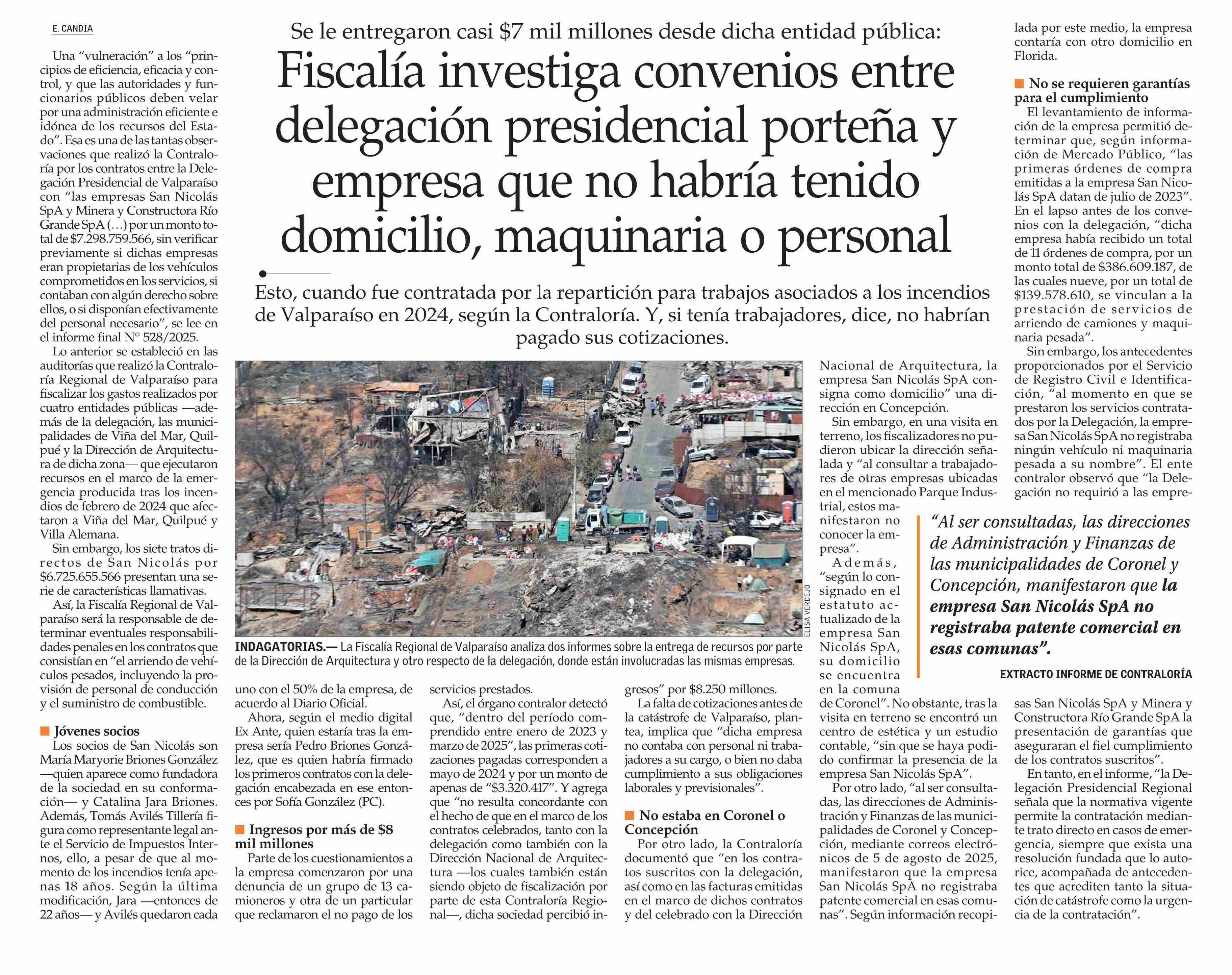 Fiscalía investiga convenios entre delegación presidencial porteña y empresa que no habría tenido domicilio, maquinaria o personal 14-02-2026 El Mercurio |