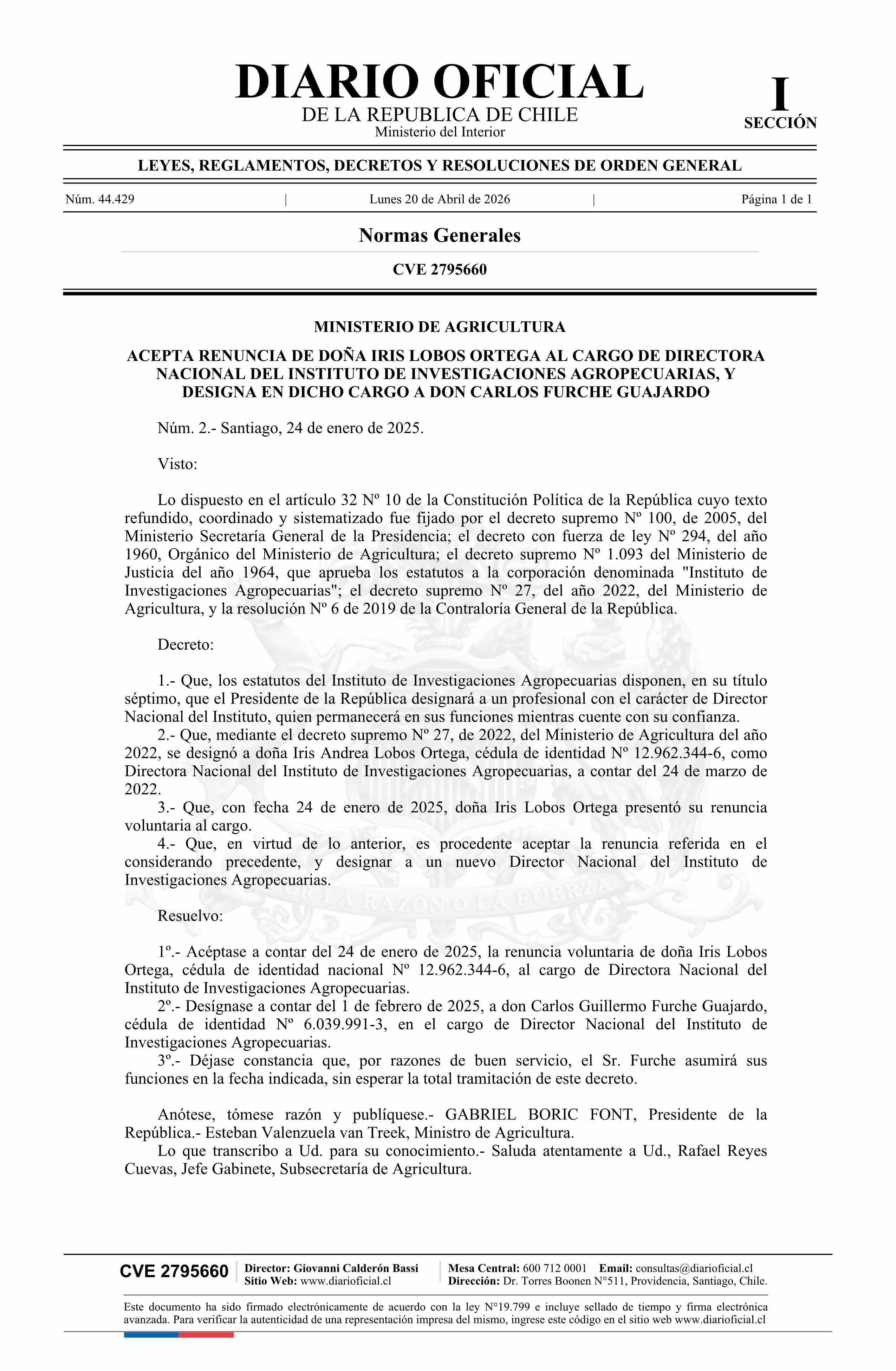 | Título: | Decreto número 2, de 2025.- Acepta renuncia de doña Iris Lobos Ortega al cargo de Directora Nacional del Instituto de Investigaciones Agropecuarias, y designa en dicho cargo a don Carlos Furche Guajardo |