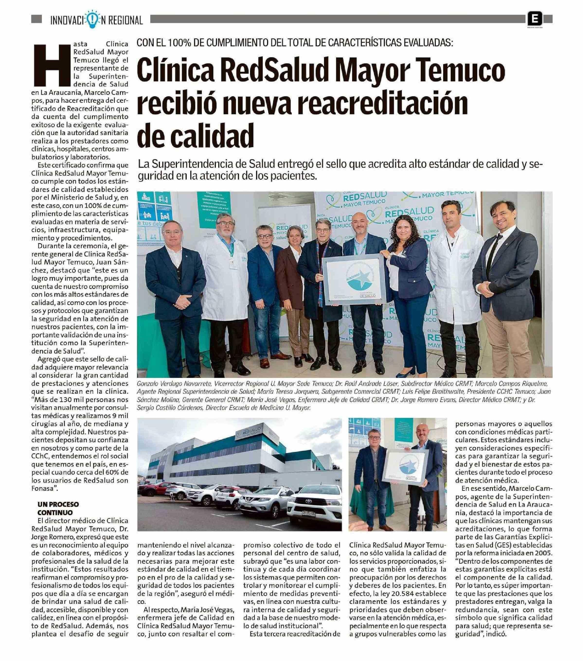 Clínica RedSalud Mayor Temuco recibió nueva reacreditación de calidad 12-05-2024 El Austral de la Araucanía |