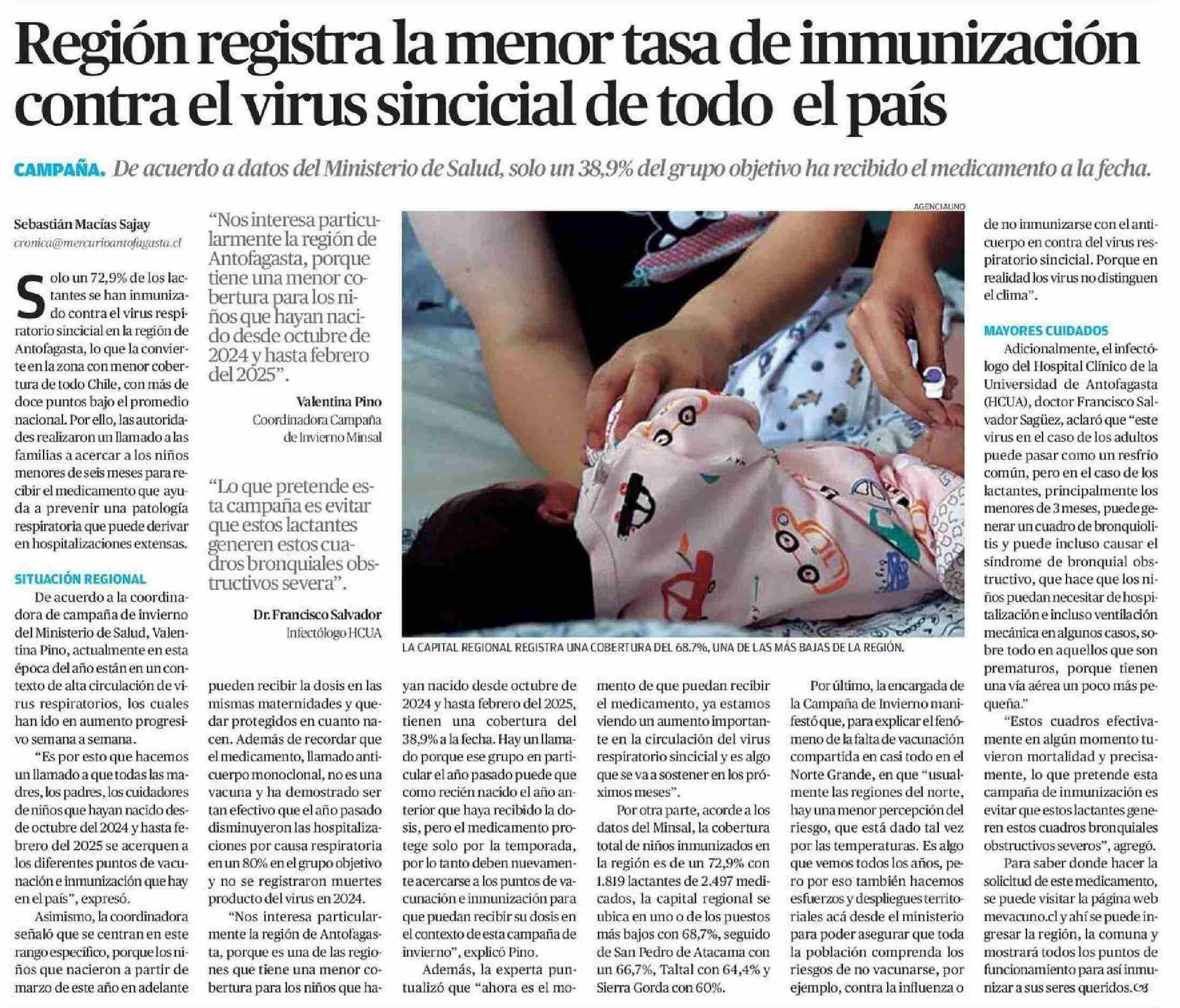 Región registra la menor tasa de inmunización contra el virus sincicial de todo el país 30-05-2025 El Mercurio de Calama |