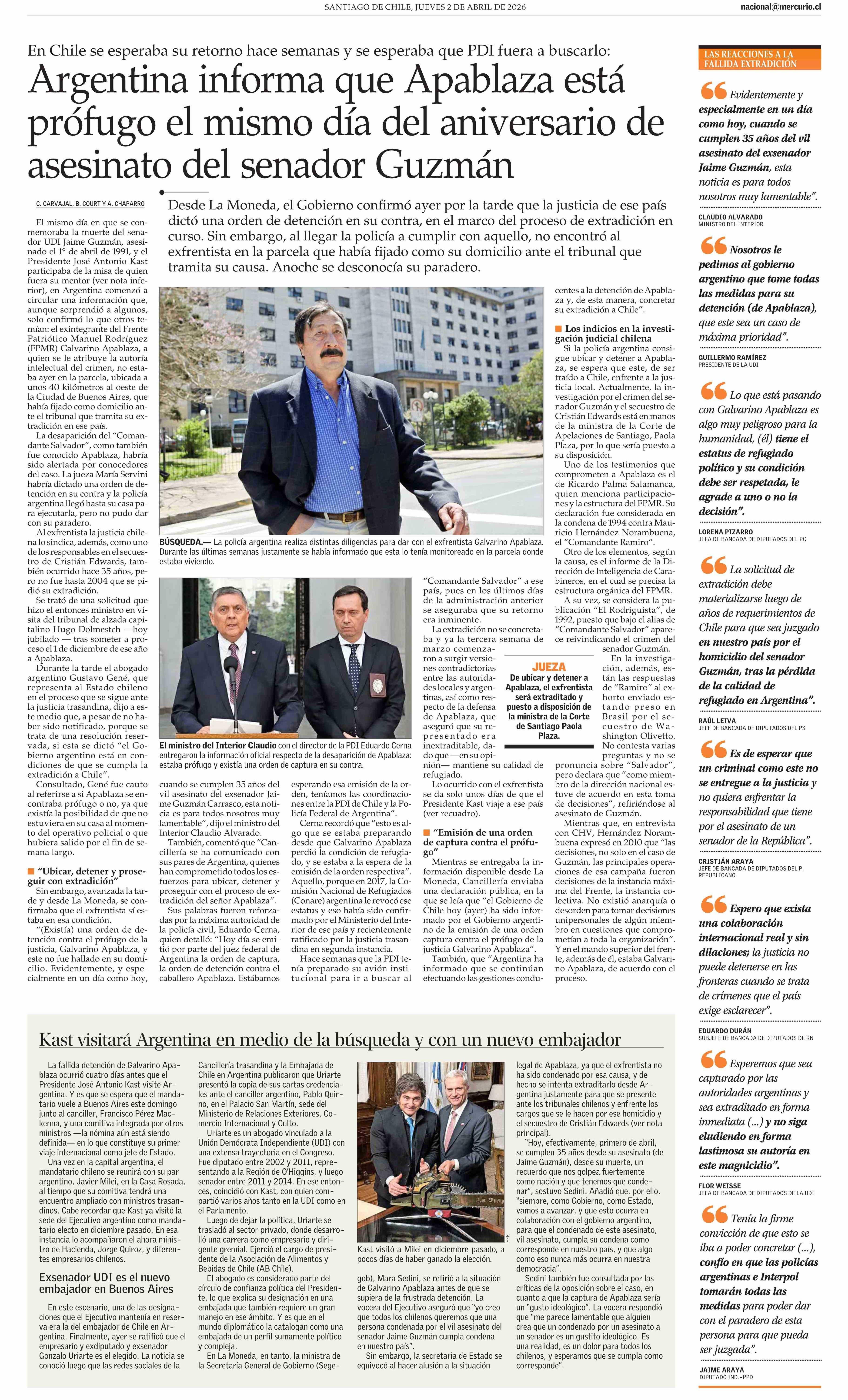 Argentina informa que Apablaza está prófugo el mismo día del aniversario de asesinato del senador Guzmán 02-04-2026 El Mercurio |