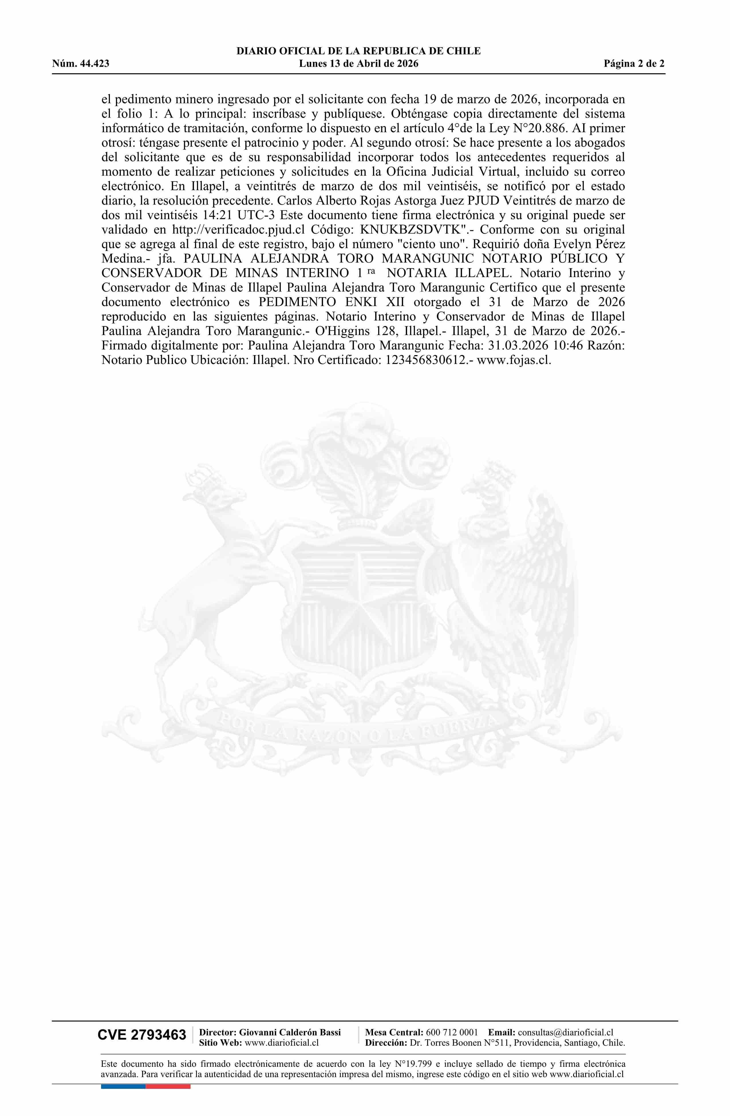 ENKI XII / Prohens Poblete Óscar Ignacio 13-04-2026 DIARIO OFICIAL CHILE - BOLETÍN OFICIAL DE MINERÍA |