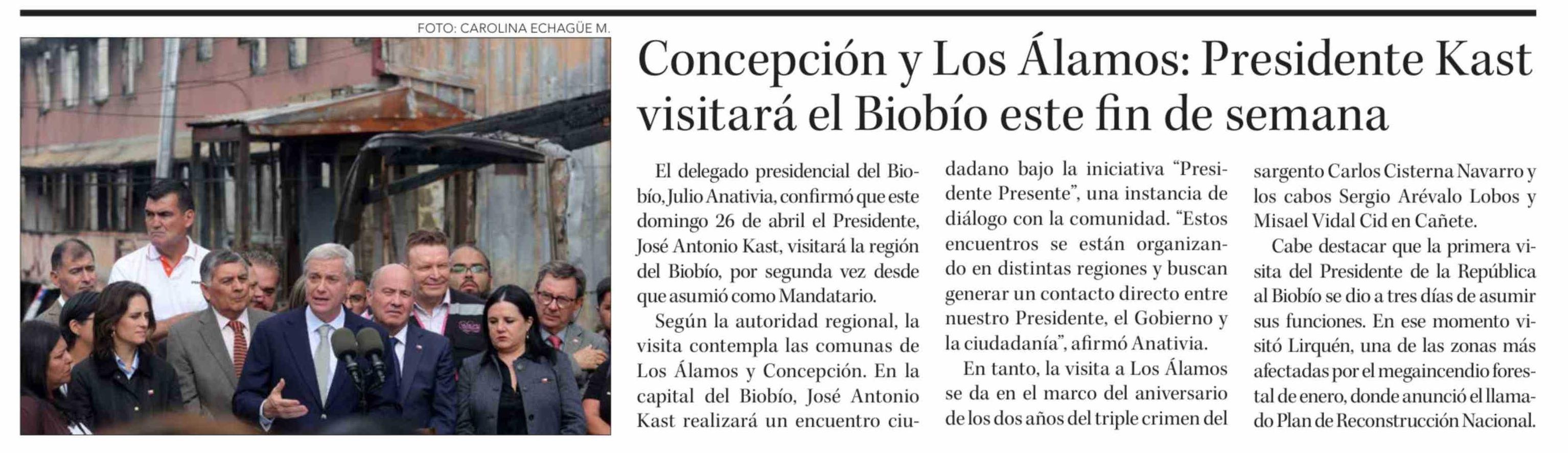 Concepción y Los Alamos: Presidente Kast visitará el Biobío este fin de semana 25-04-2026 Diario Concepción |