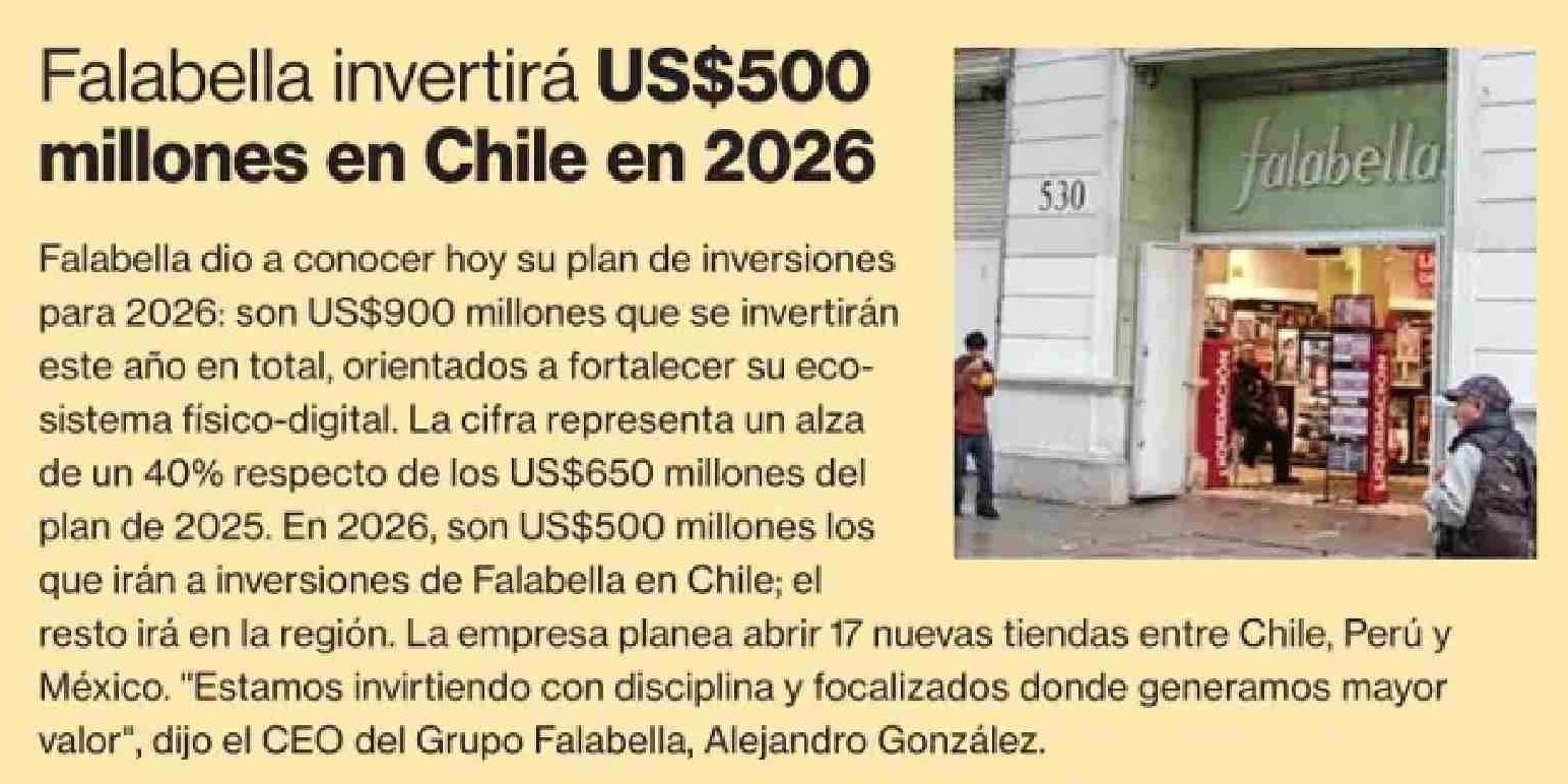 | Título: | Falabella invertirá US$500 millones en Chile en 2026 |