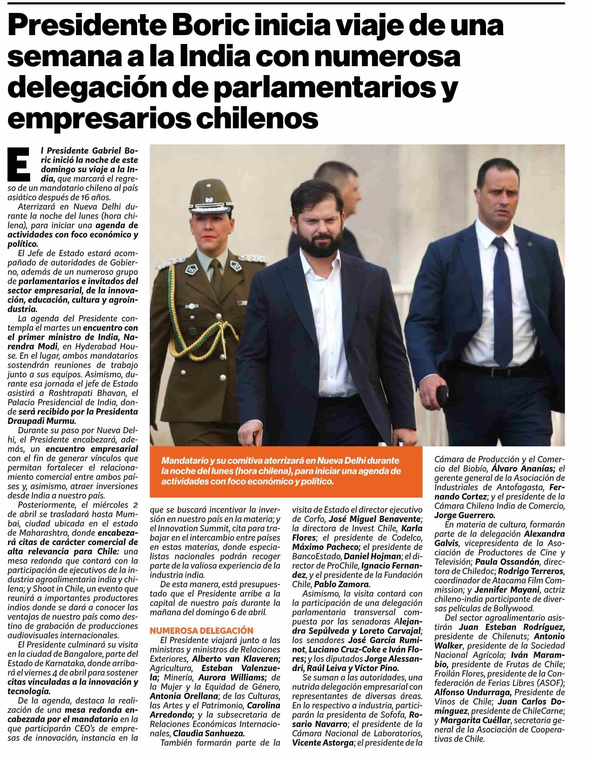 | Título: | Presidente Boric inicia viaje de una semana a la India con numerosa delegación de parlamentarios y empresarios chilenos |