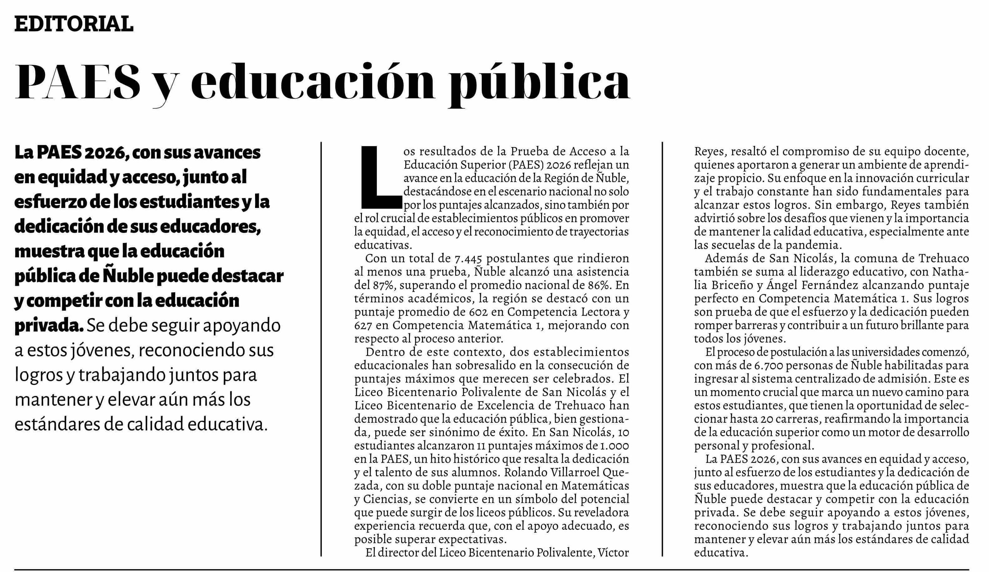 Editorial: PAES y educación pública 06-01-2026 La Discusión |