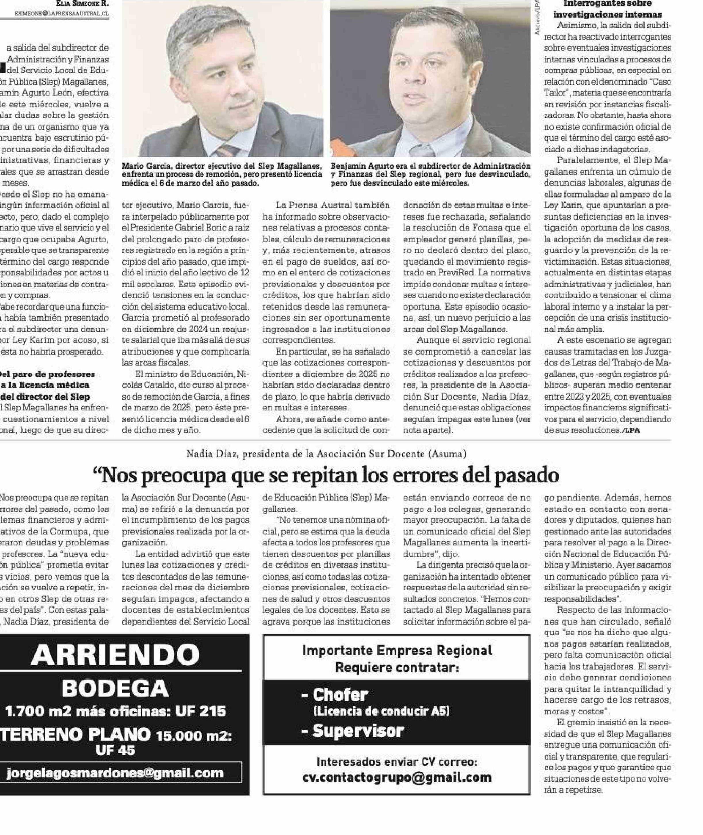 Cesan de su cargo a subdirector de Administración y Finanzas del Slep Magallanes 30-01-2026 La Prensa Austral |