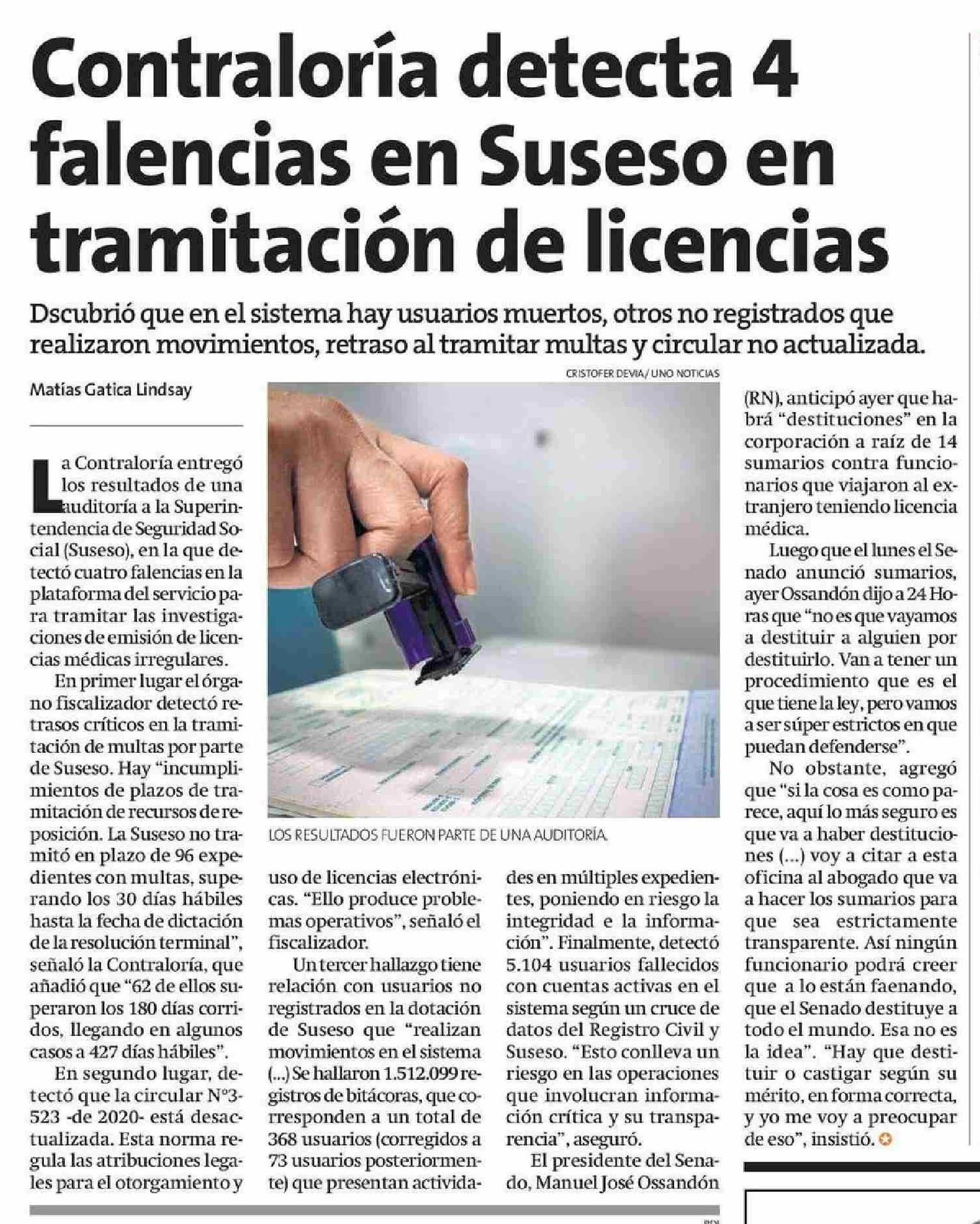 | Título: | Contraloría detecta 4 falencias en Suseso en tramitación de licencias |