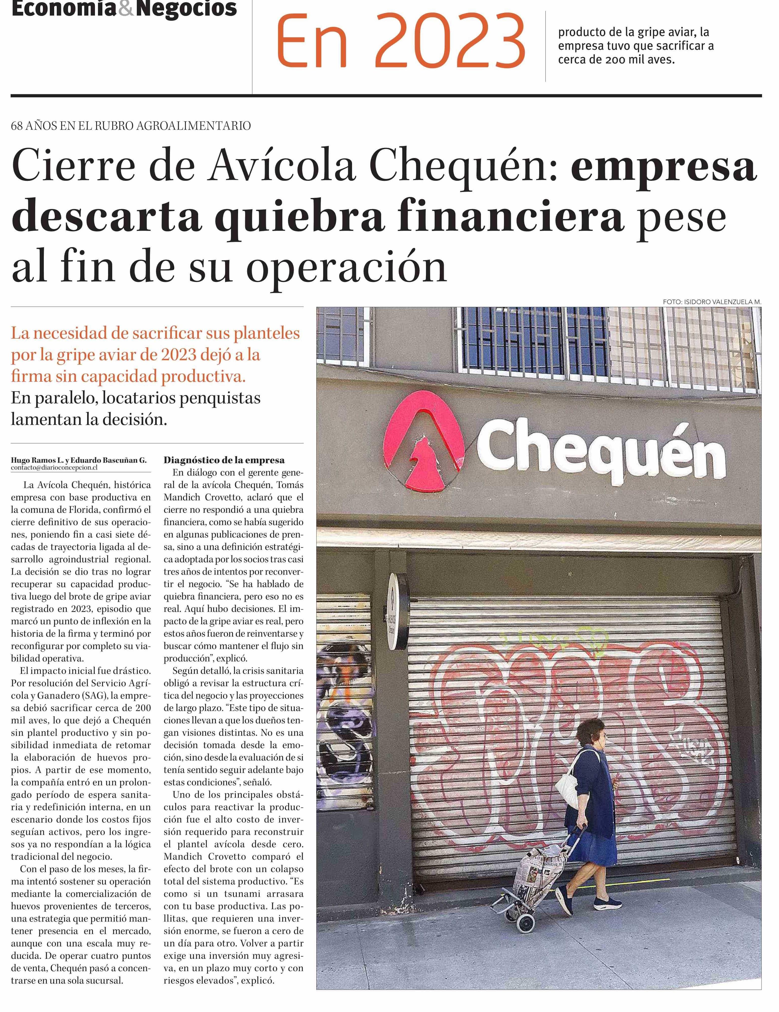 Cierre de Avícola Chequén: empresa descarta quiebra financiera pese al fin de su operación 06-02-2026 Diario Concepción |