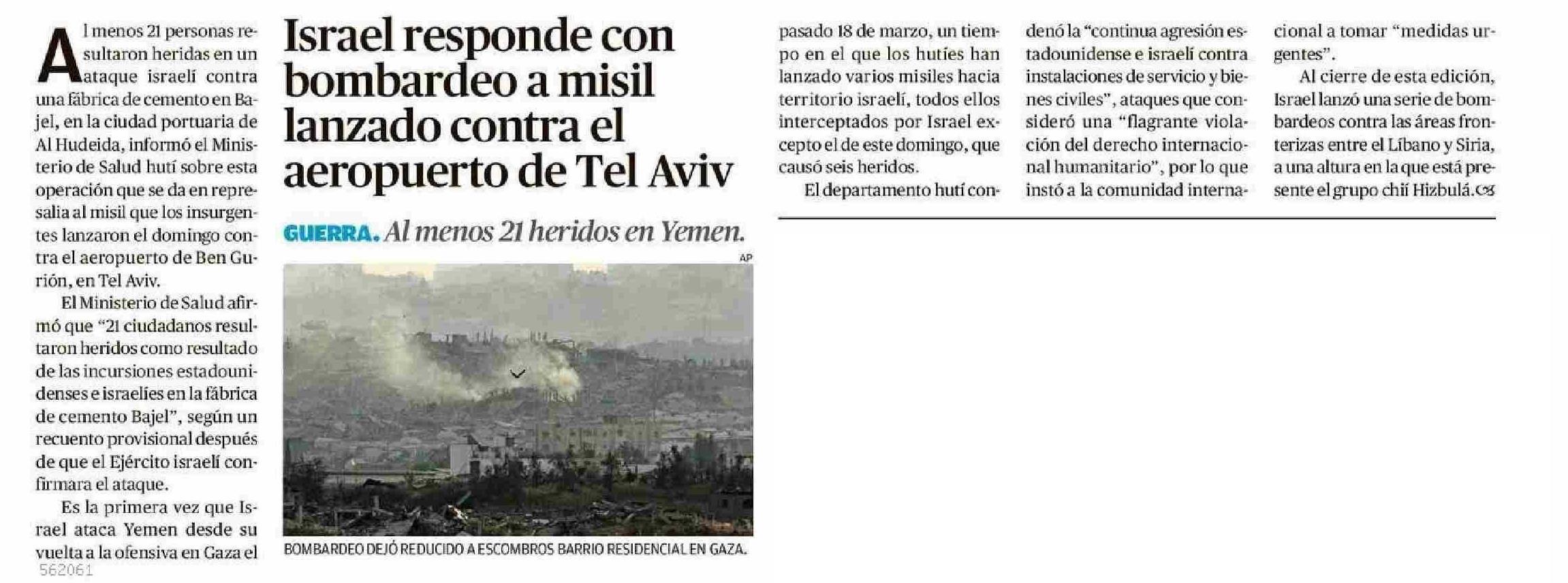 | Título: | Israel responde con bombardeo a misil lanzado contra el aeropuerto de Tel Aviv |