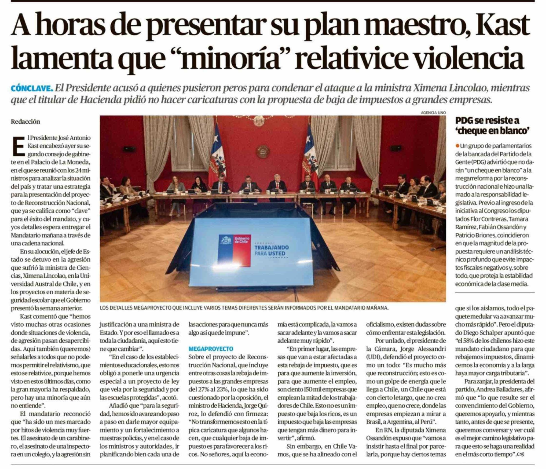 Título: A horas de presentar su plan maestro, Kast lamenta que "minoría" relativice violencia