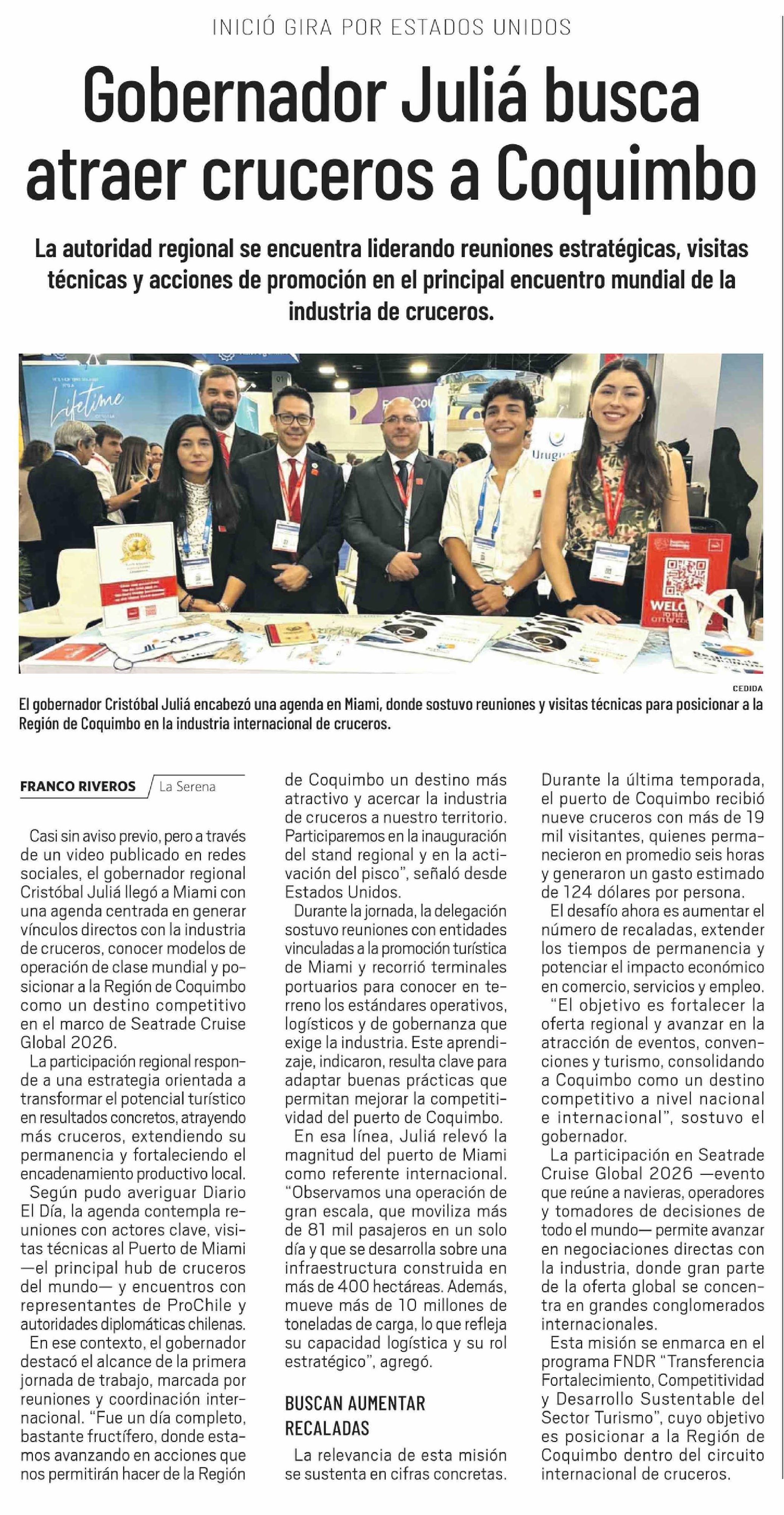 Gobernador Juliá busca atraer cruceros a Coquimbo 15-04-2026 El Día |