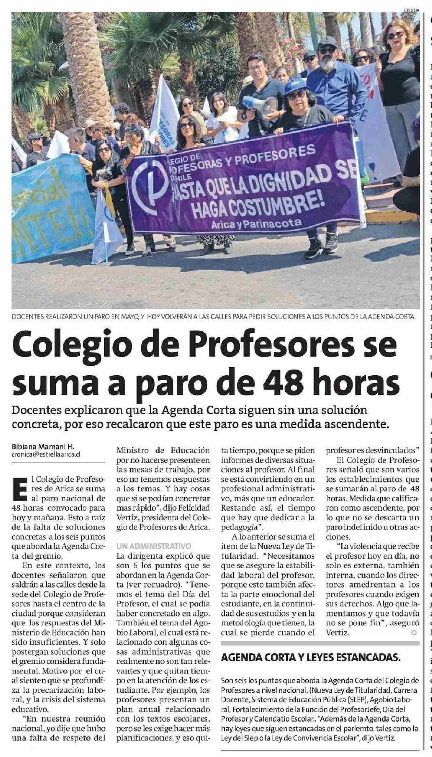 Colegio de Profesores se suma a paro de 48 horas 04-06-2025 La Estrella de Arica |