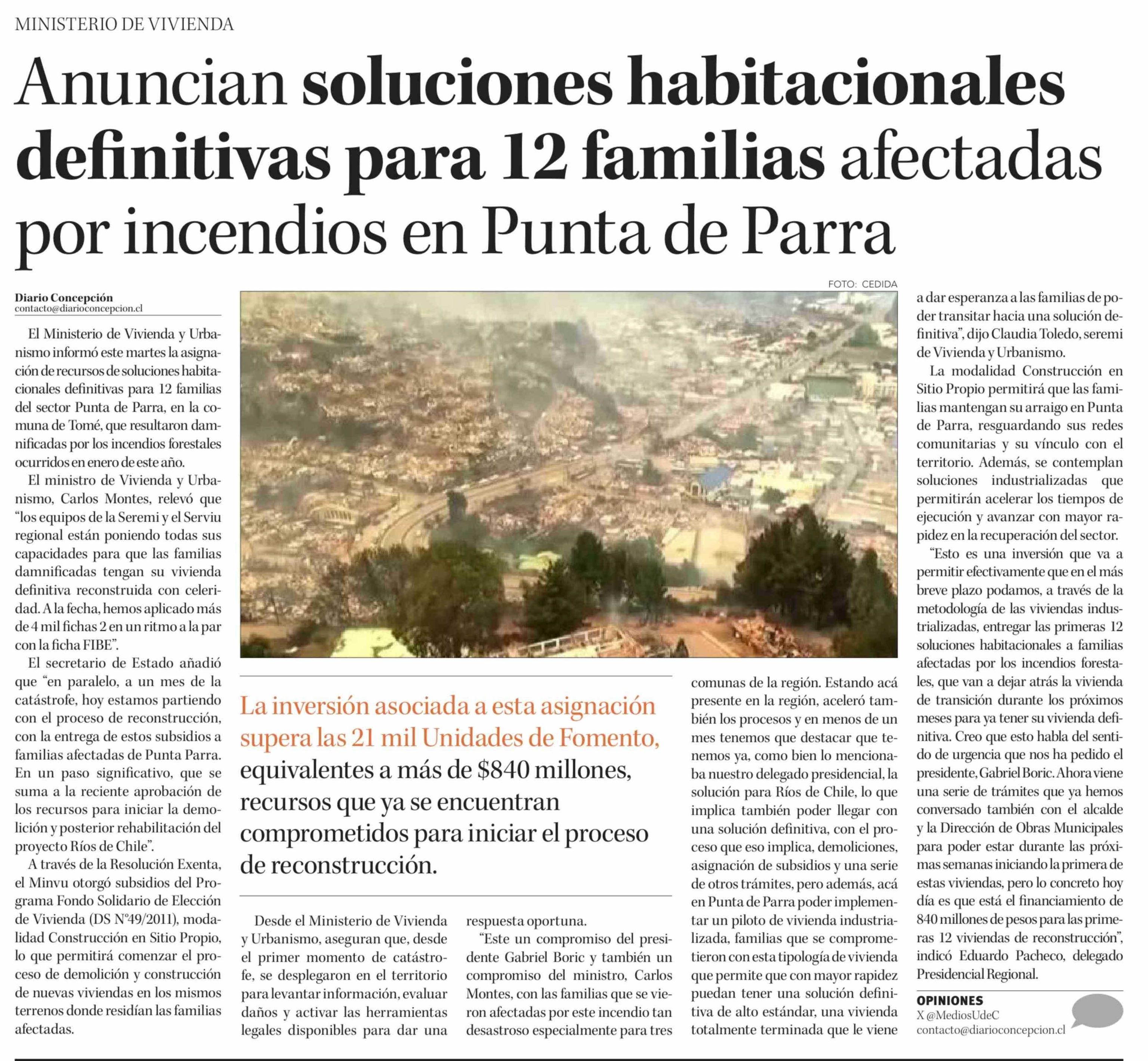 Anuncian soluciones habitacionales definitivas para 12 familias afectadas por incendios en Punta de Parra 17-02-2026 Diario Concepción |