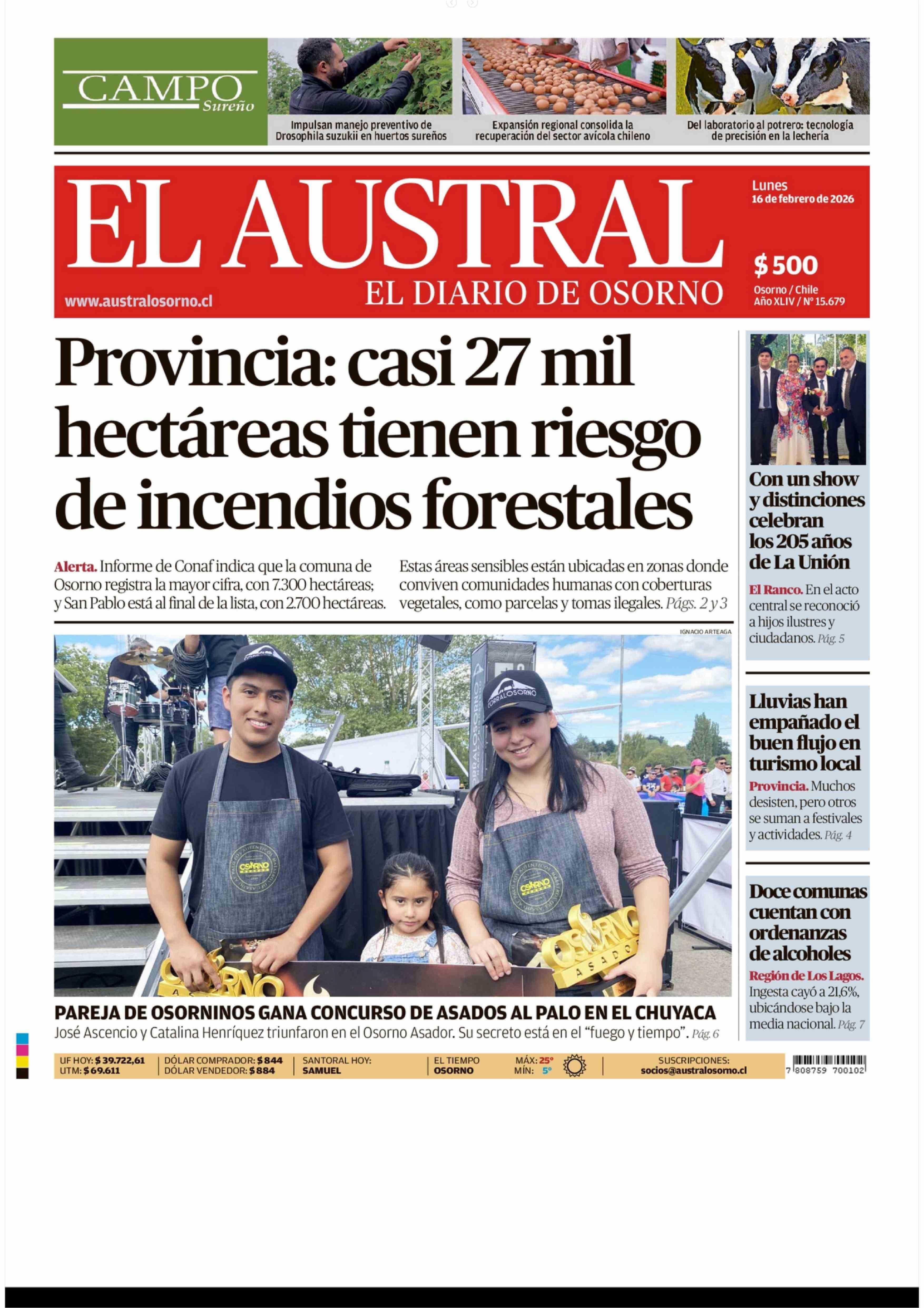 PORTADA EL AUSTRAL DE OSORNO CHILE 16-02-2026 El Austral de Osorno |