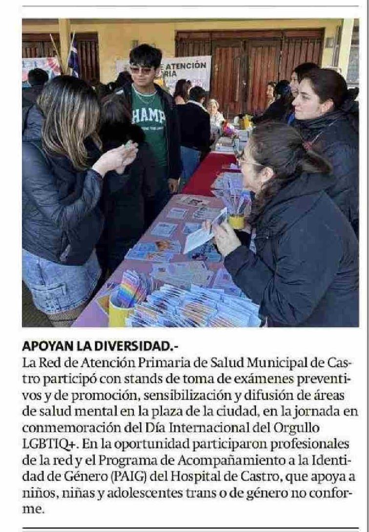 | Título: | APOYAN LA DIVERSIDAD .La Red de Atención Primaria de Salud Municipal de Castro participó con stands de toma de exámenes preventivos y de promoción, sensibilización y difusión de áreas de salud mental en la plaza de la ciudad, en la jornada en conmemoración del Día Internacional del Orgullo LGBTIQ+. |