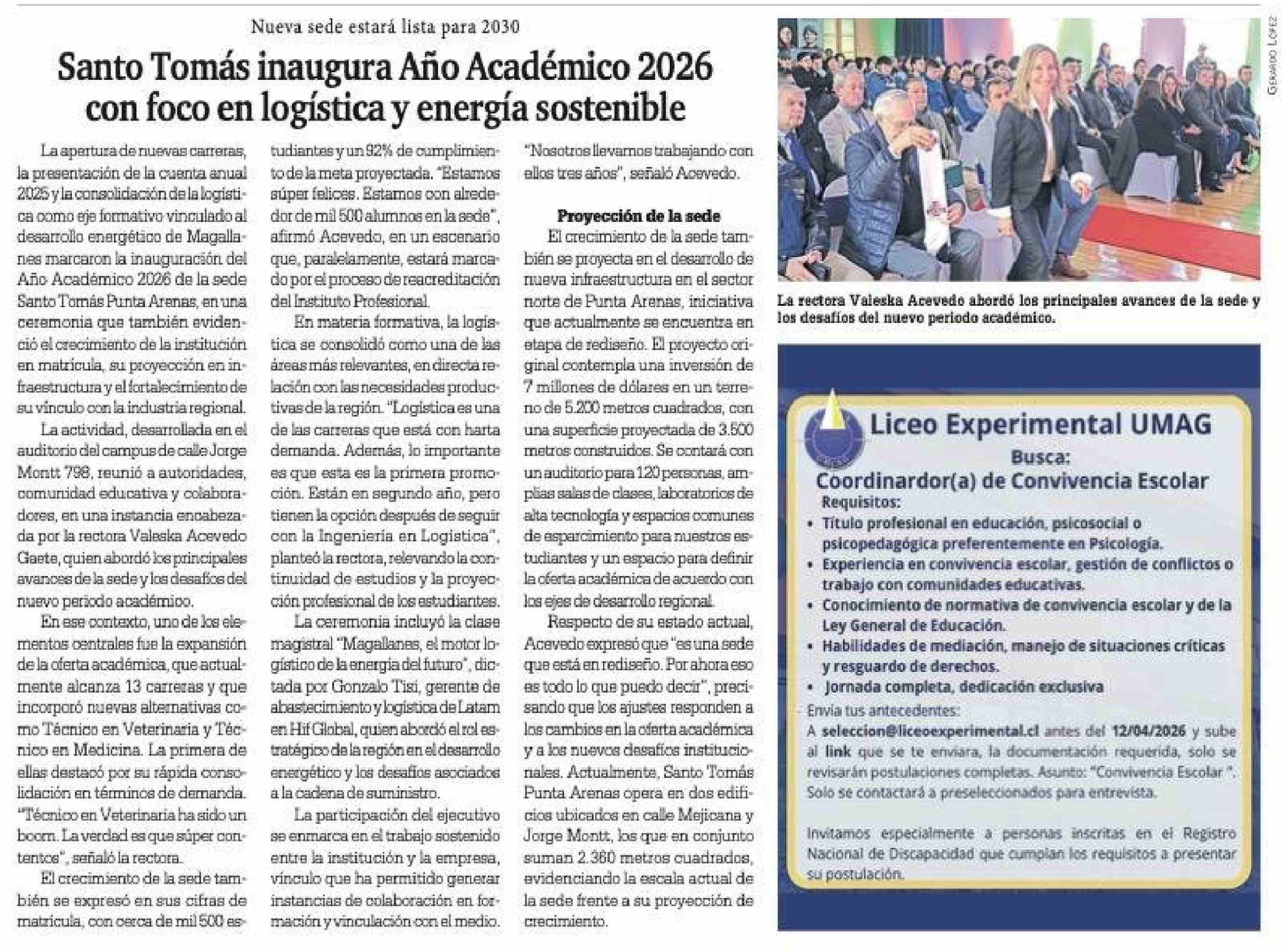 Santo Tomás inaugura Año Académico 2026 con foco en logística y energía sostenible 09-04-2026 La Prensa Austral |