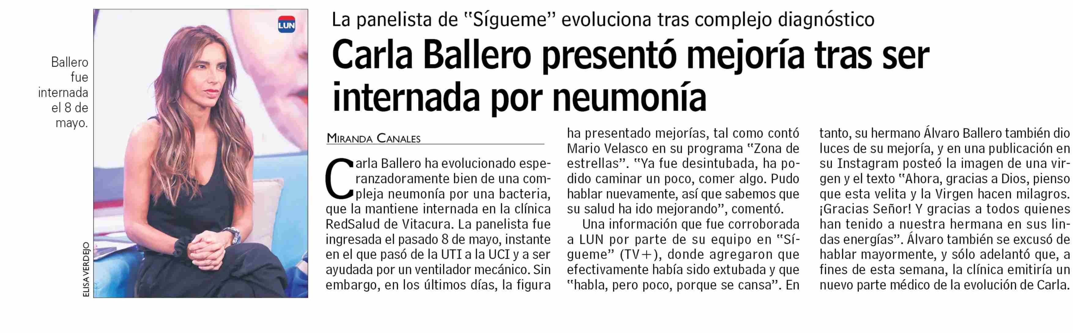 | Título: | Carla Ballero presentó mejoría tras ser 1 internada por neumonía |