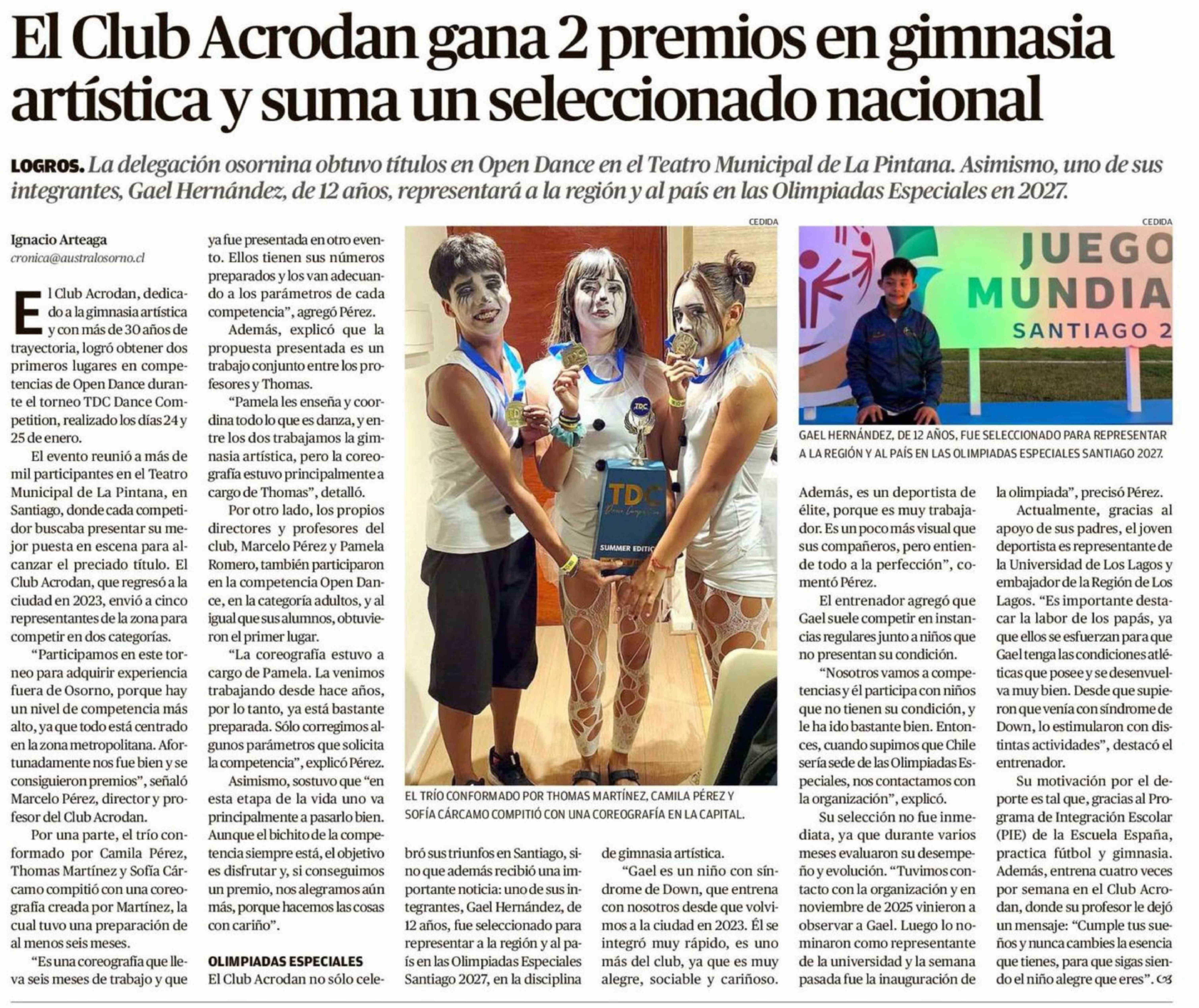 El Club Acrodan gana 2 premios en gimnasia artística y suma un seleccionado nacional 03-02-2026 El Austral de Osorno |