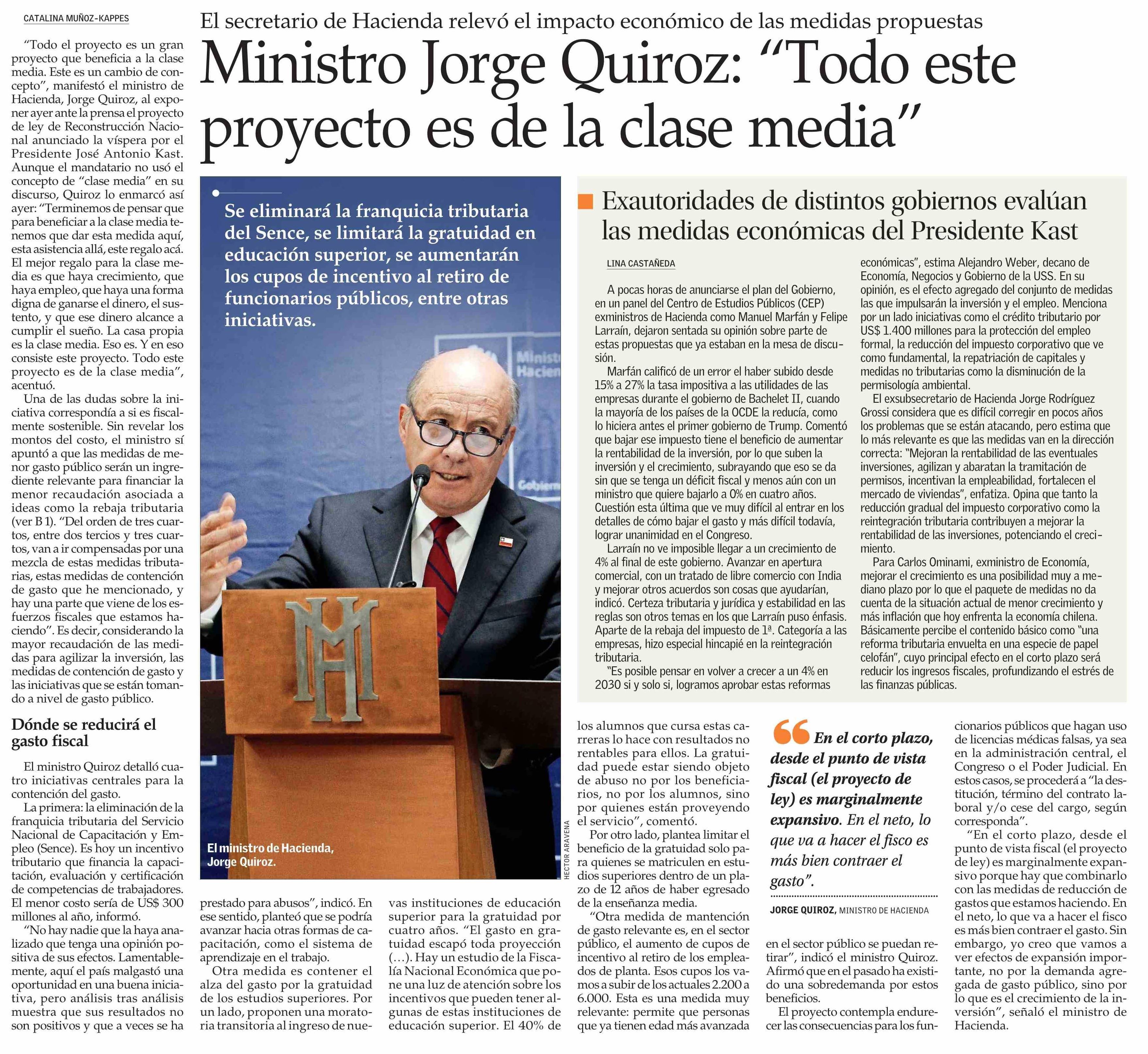 Ministro Jorge Quiroz: “Todo este proyecto es de la clase media” 17-04-2026 El Mercurio |