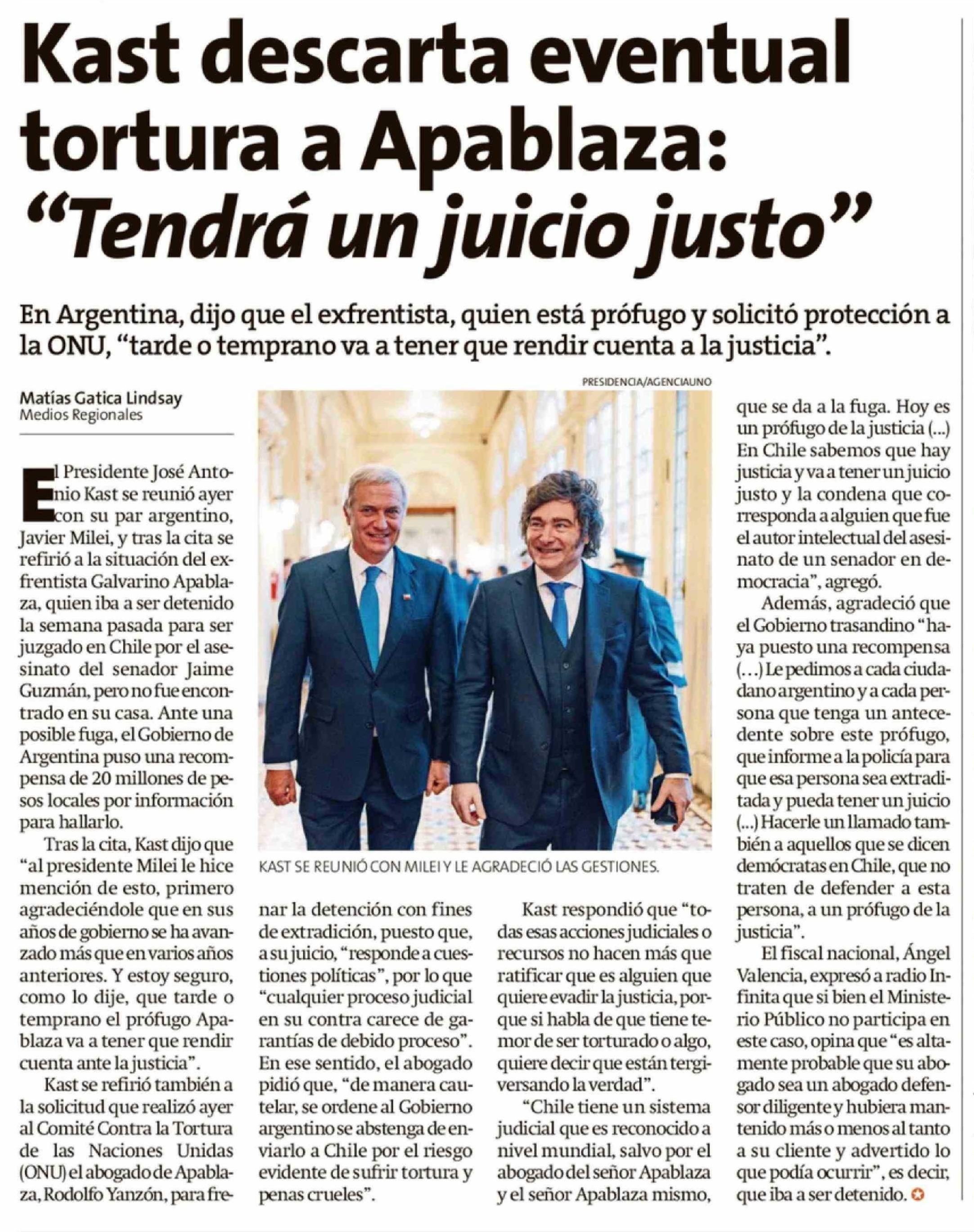 Título: Kast descarta eventual tortura a Apablaza: "Tendrá un juicio justo"
