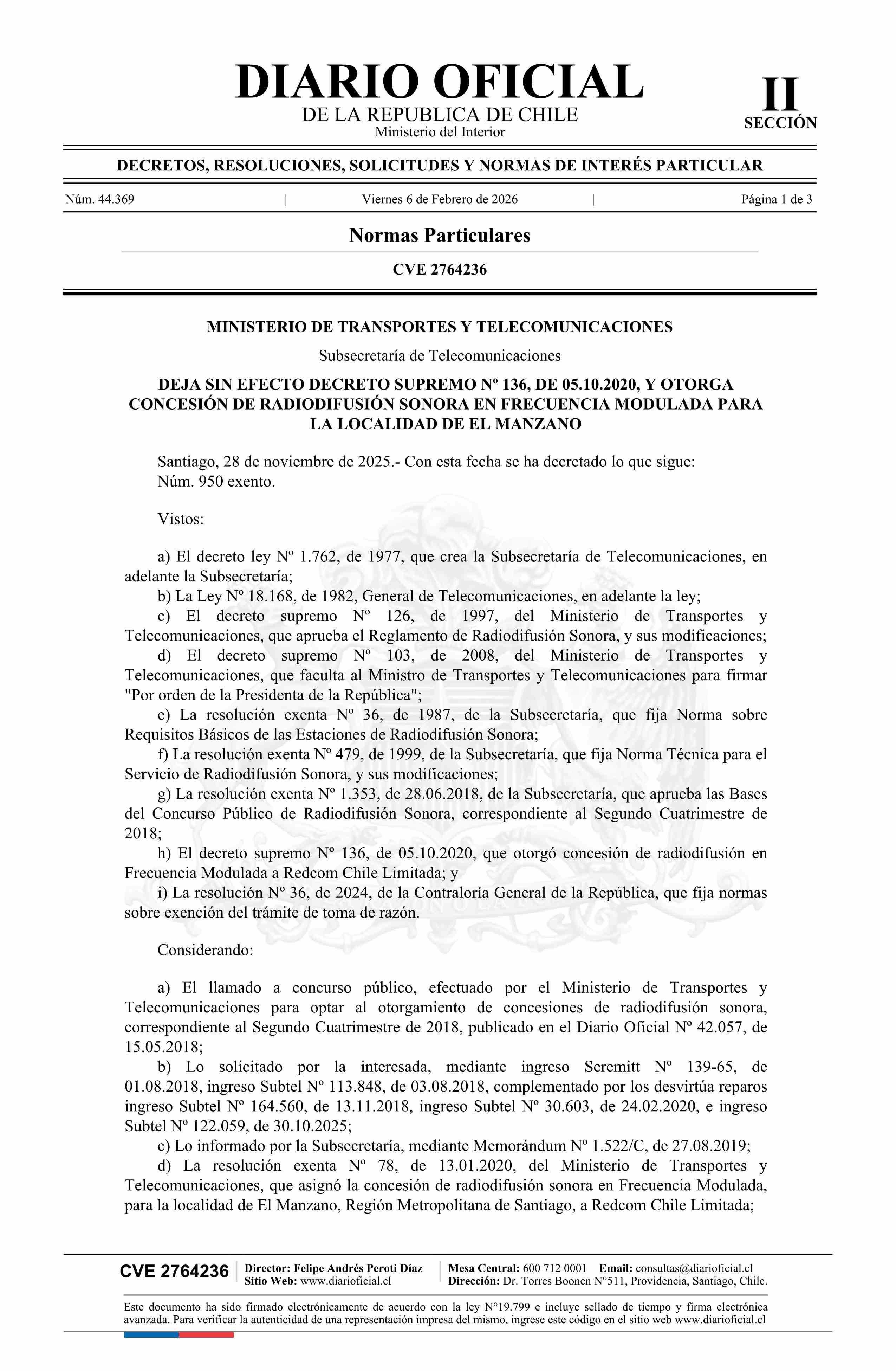 Título: Decreto exento número 950, de 2025.- Deja sin efecto decreto Nº 136, de 2020, y otorga concesión de radiodifusión sonora en frecuencia modulada para la localidad de El Manzano