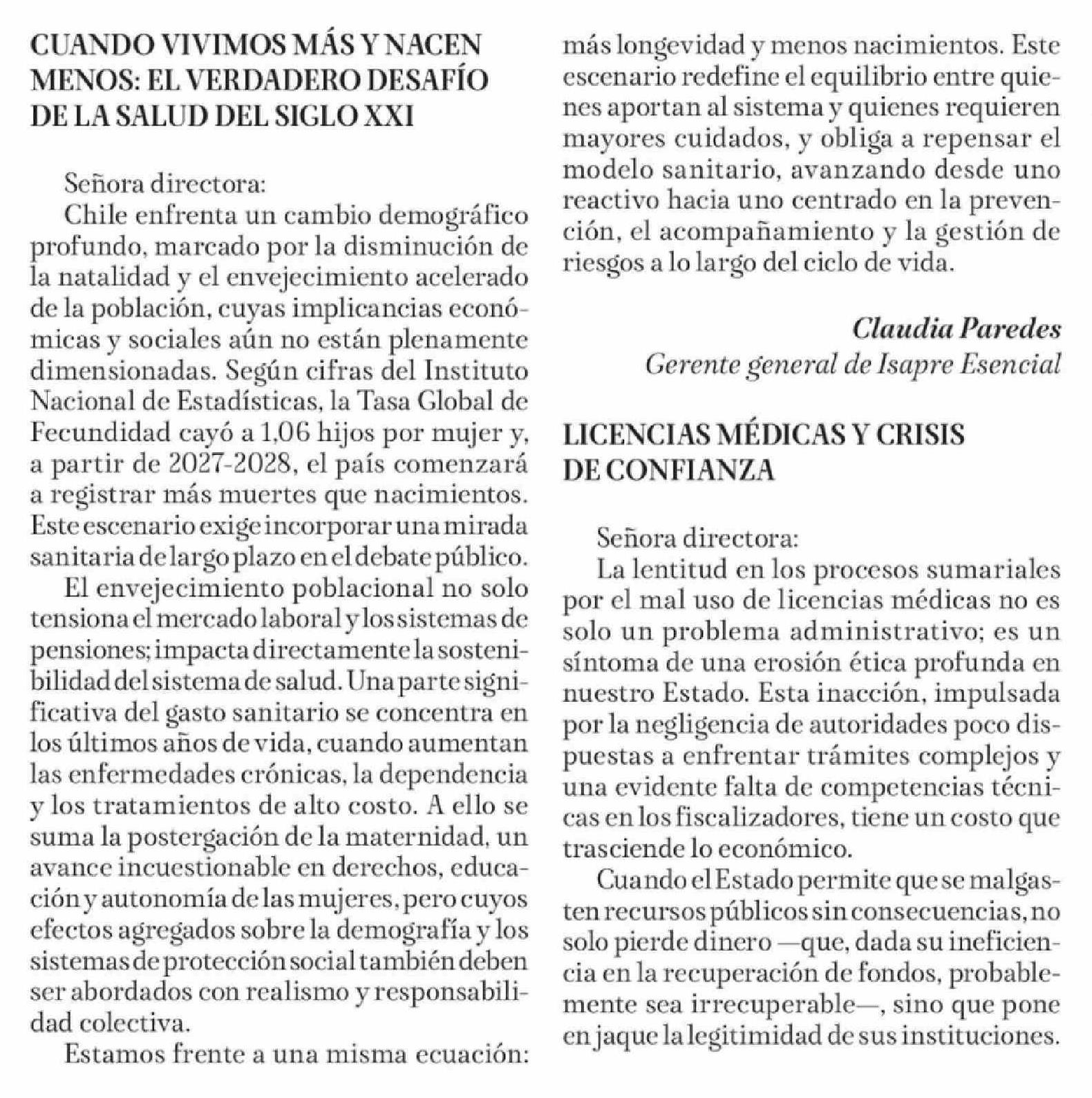 Título: Cartas: CUANDO VIVIMOS MÁS Y NACEN MENOS: EL VERDADERO DESAFÍO DE LA SALUD DEL SIGLO XXI