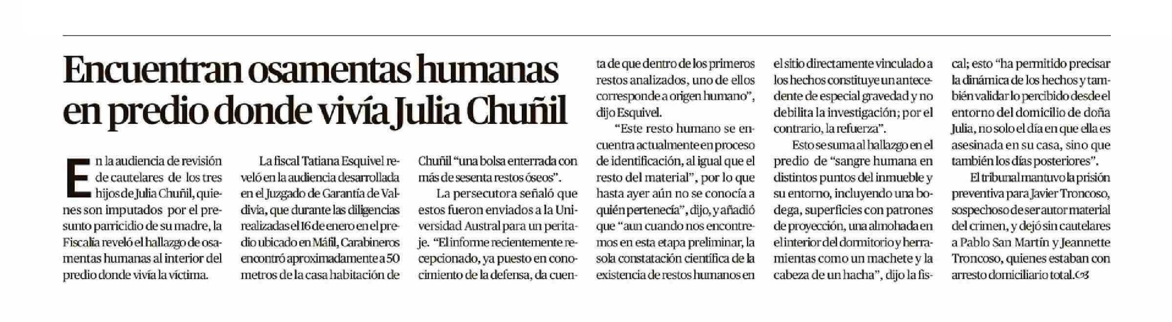 Título: Encuentran osamentas humanas en predio donde vivía Julia Chuñil