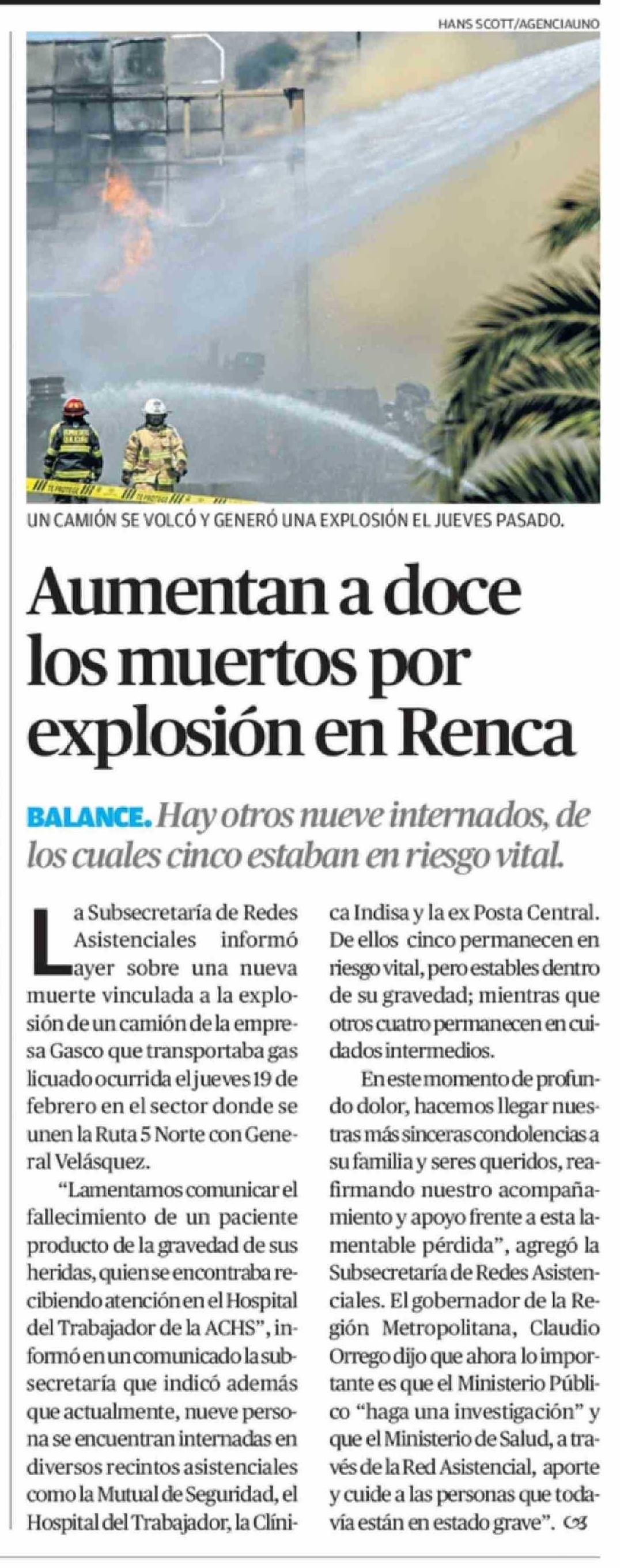 Aumentan a doce los muertos por explosión en Renca 26-02-2026 El Mercurio de Antofagasta |