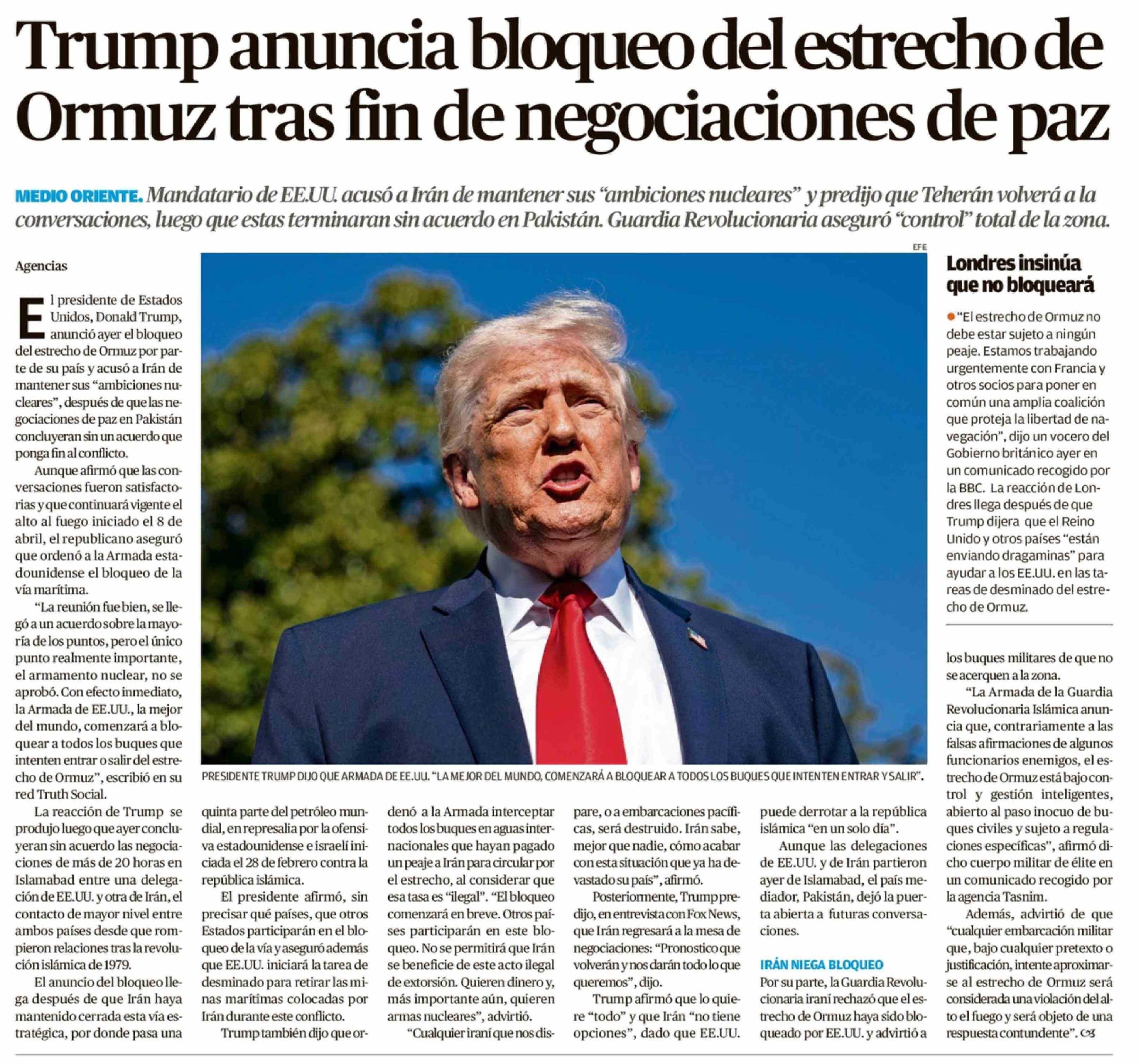 | Título: | Trump anuncia bloqueo del estrecho de Ormuz tras fin de negociaciones de paz |