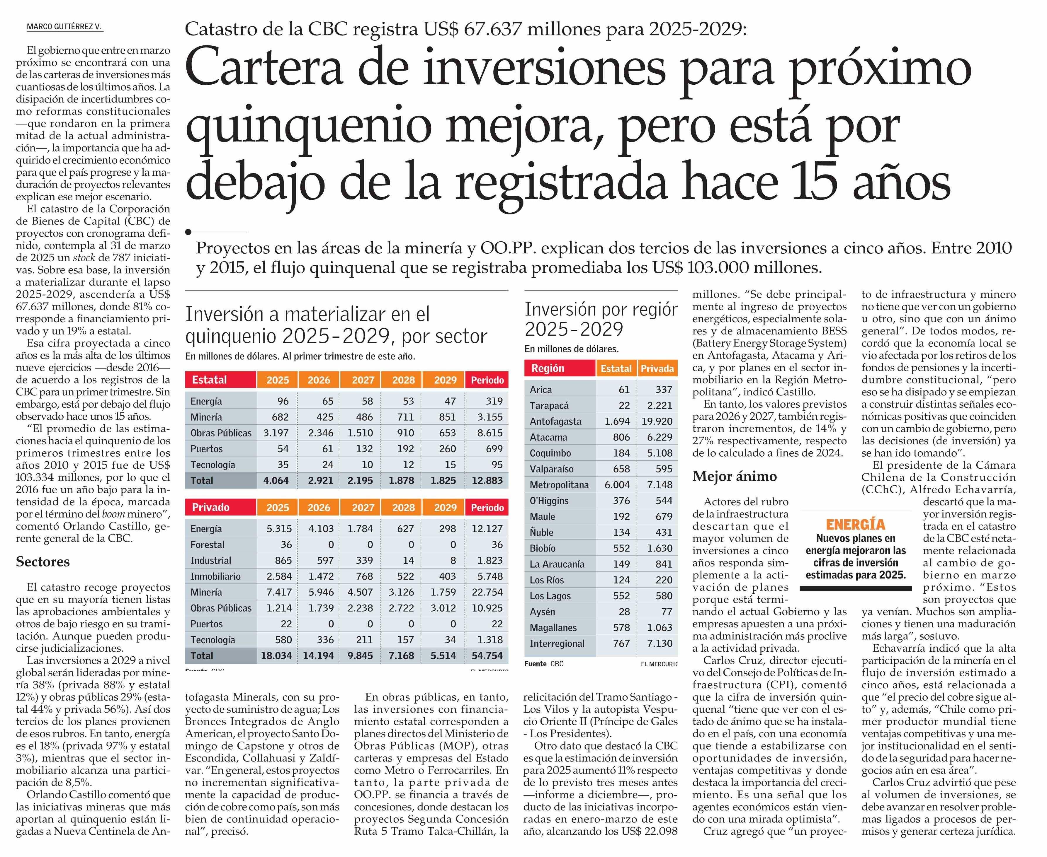 Título: Cartera de inversiones para próximo quinquenio mejora, pero está por debajo de la registrada hace 15 años