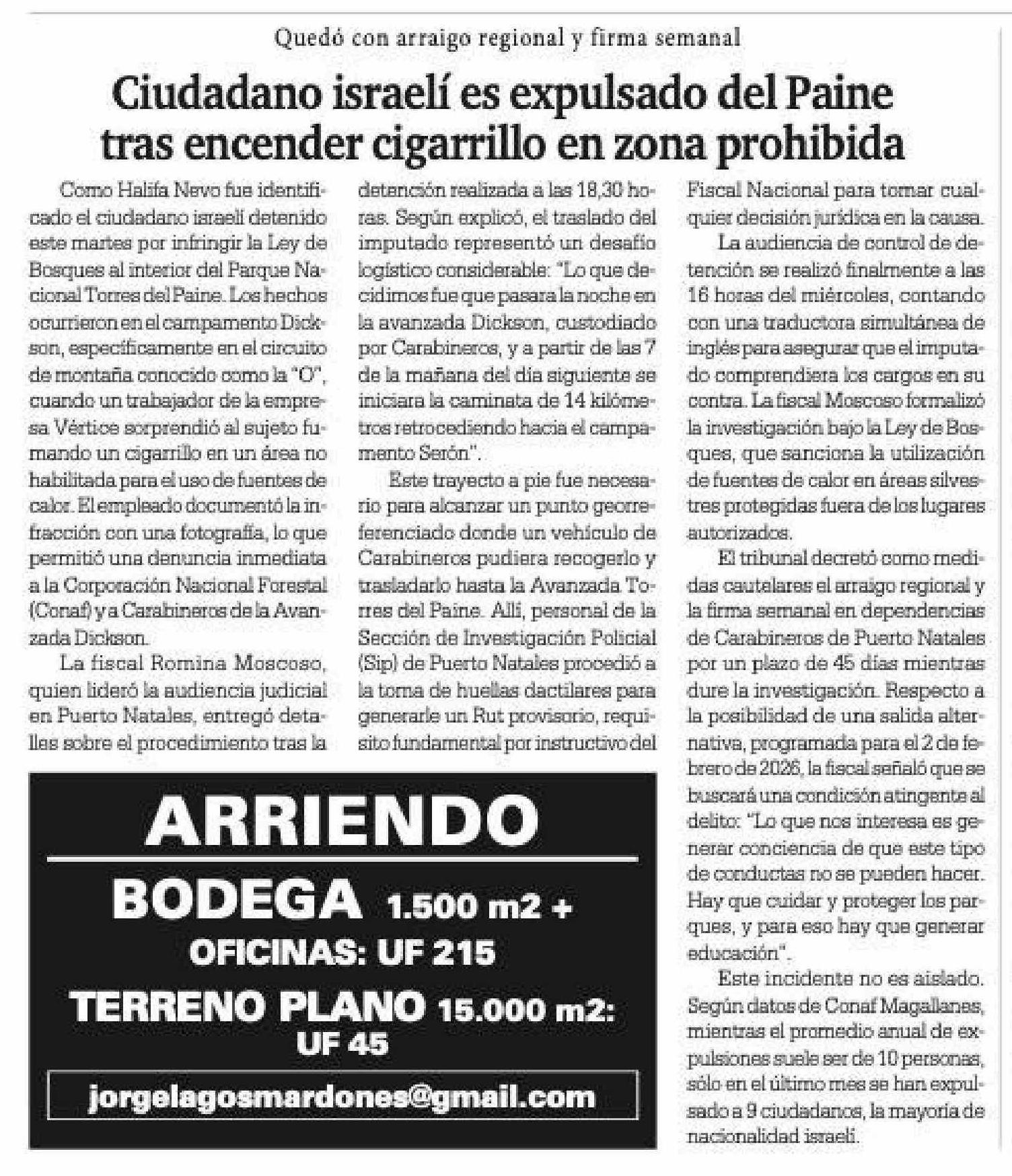 Ciudadano israelí es expulsado del Paine tras encender cigarrillo en zona prohibida 16-01-2026 La Prensa Austral |