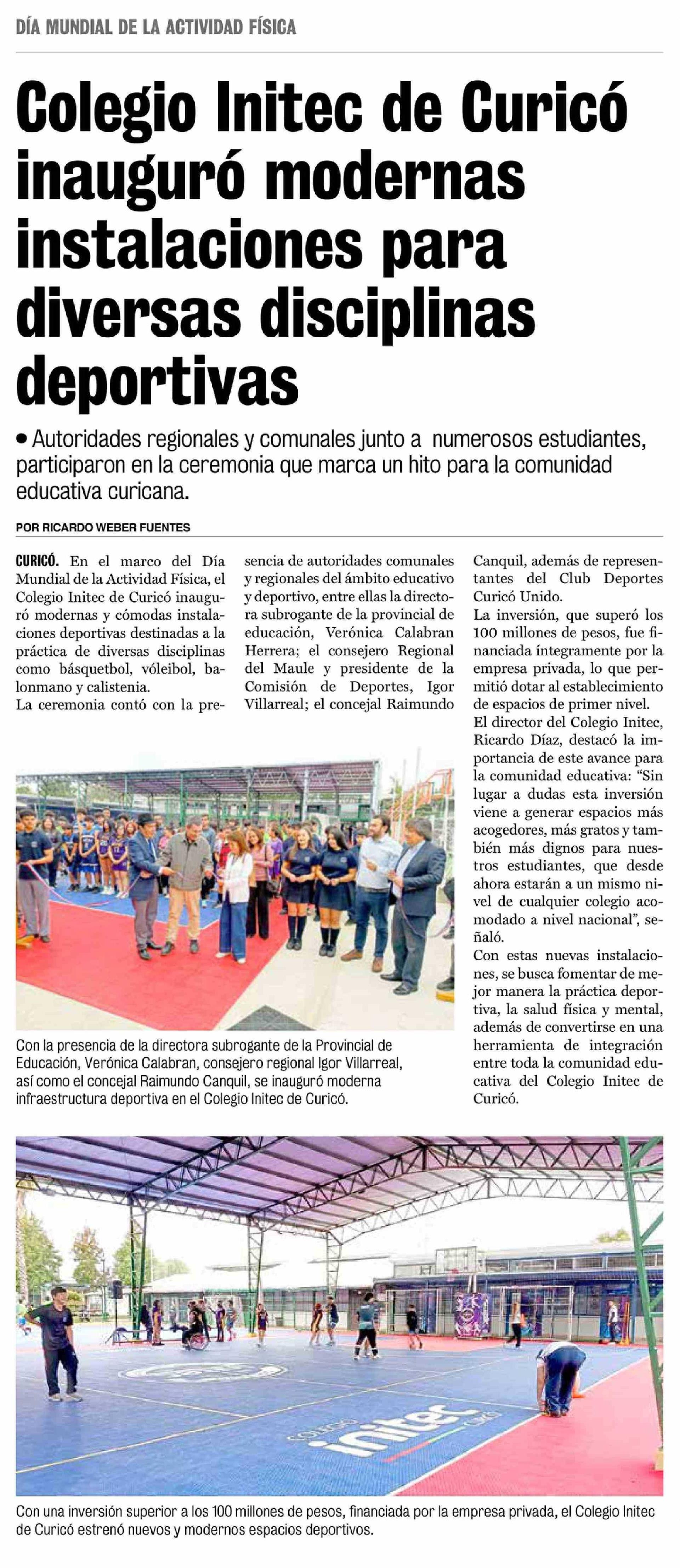 Colegio Initec de Curicó inauguró modernas instalaciones para diversas disciplinas deportivas 07-04-2026 La Prensa de Curicó |