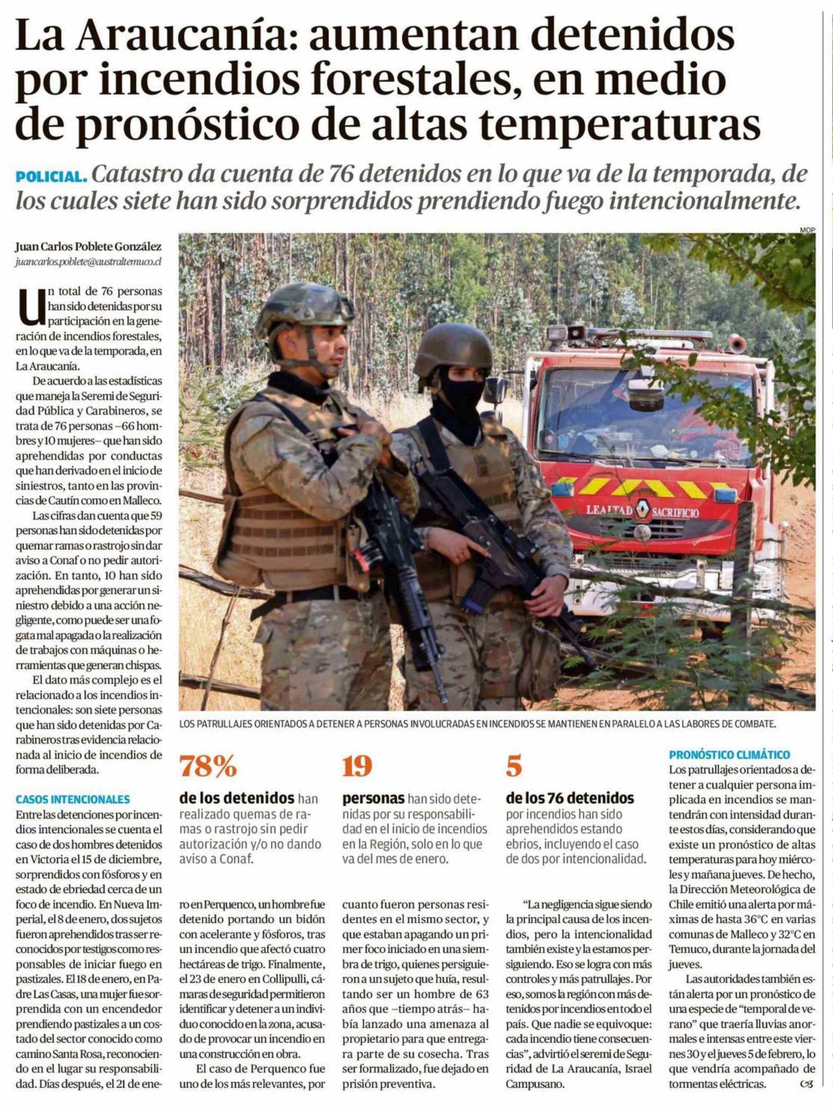 Título: La Araucanía: aumentan detenidos por incendios forestales, en medio de pronóstico de altas temperaturas