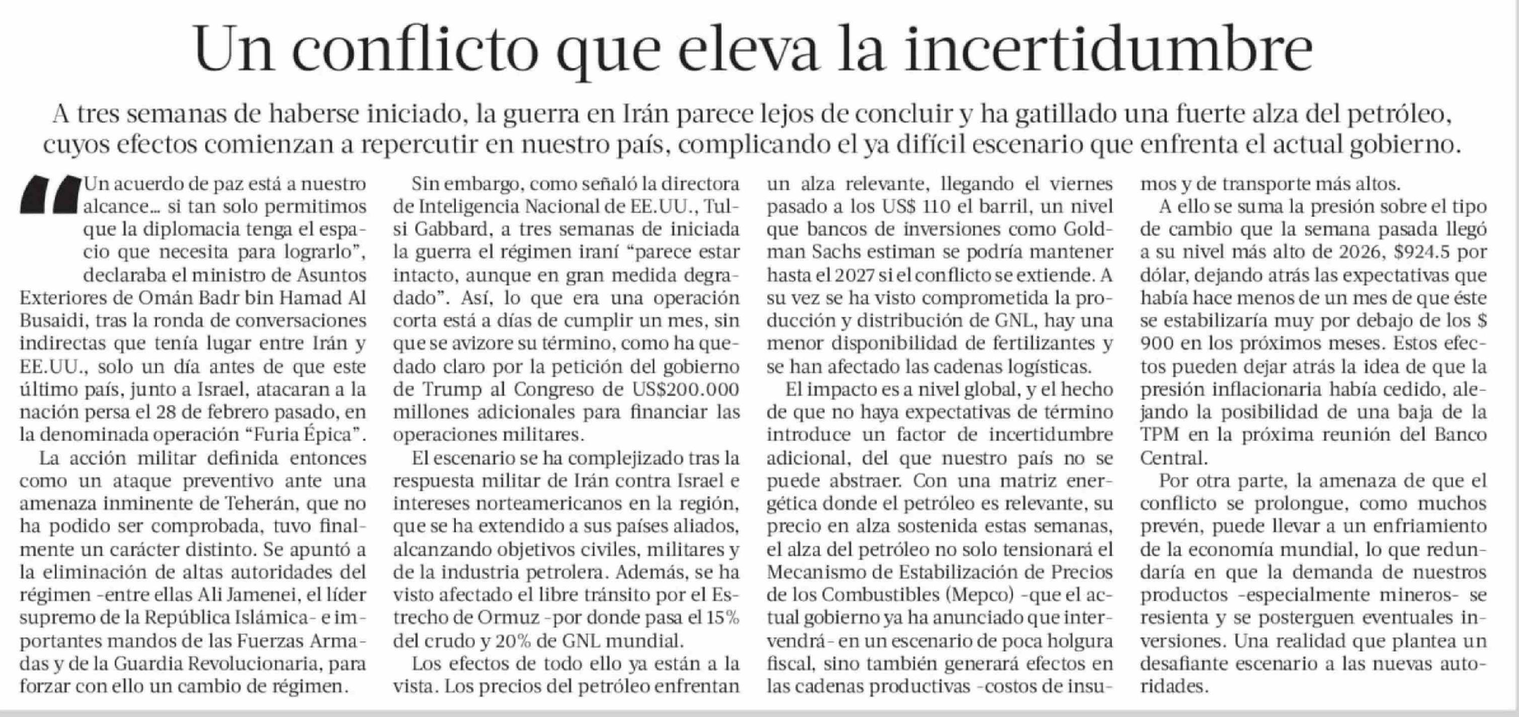 Editorial: Un conflicto que eleva la incertidumbre 23-03-2026 La Tercera |