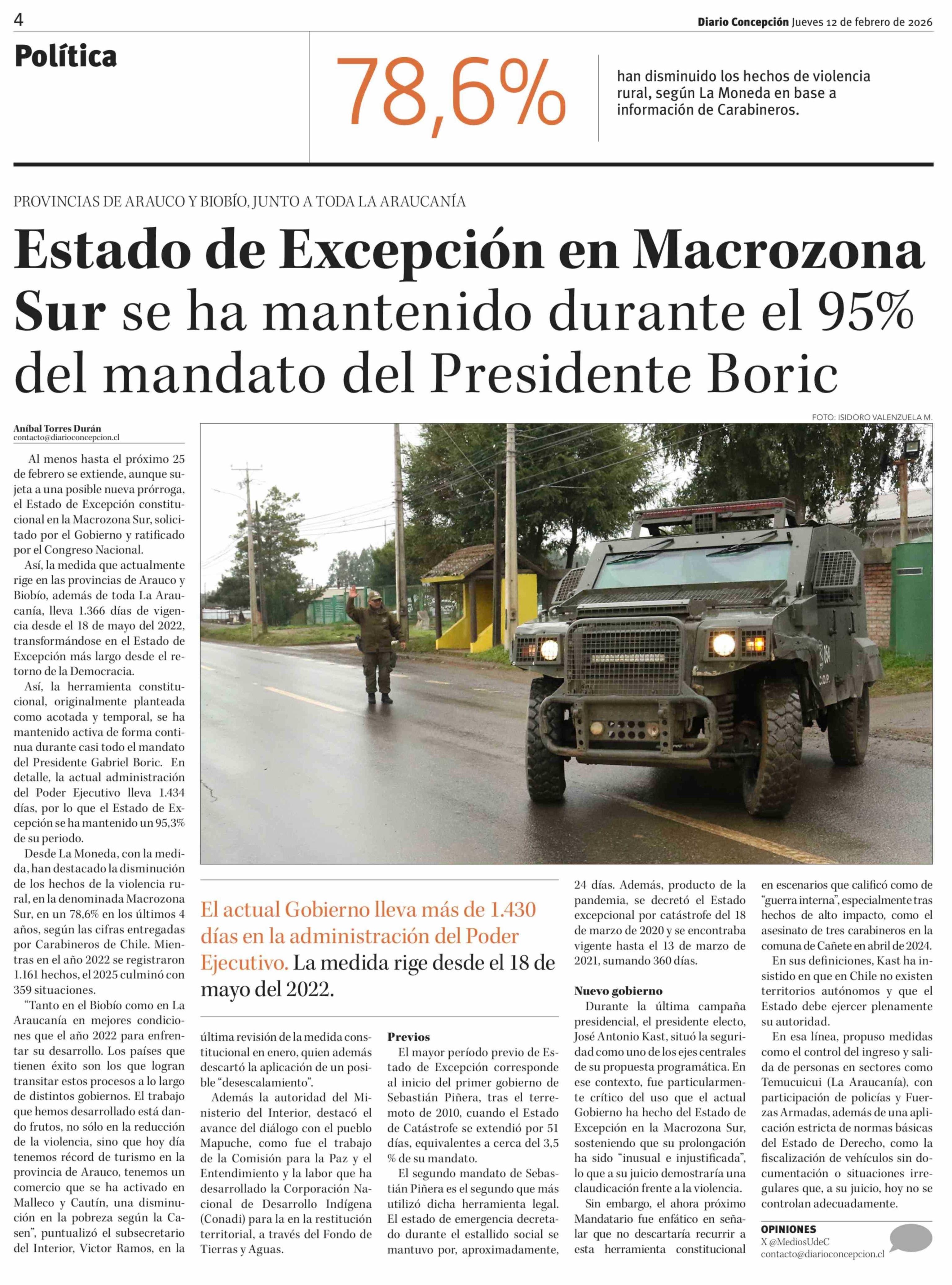 Título: Estado de Excepción en Macrozona Sur se ha mantenido durante el 95% del mandato del Presidente Boric