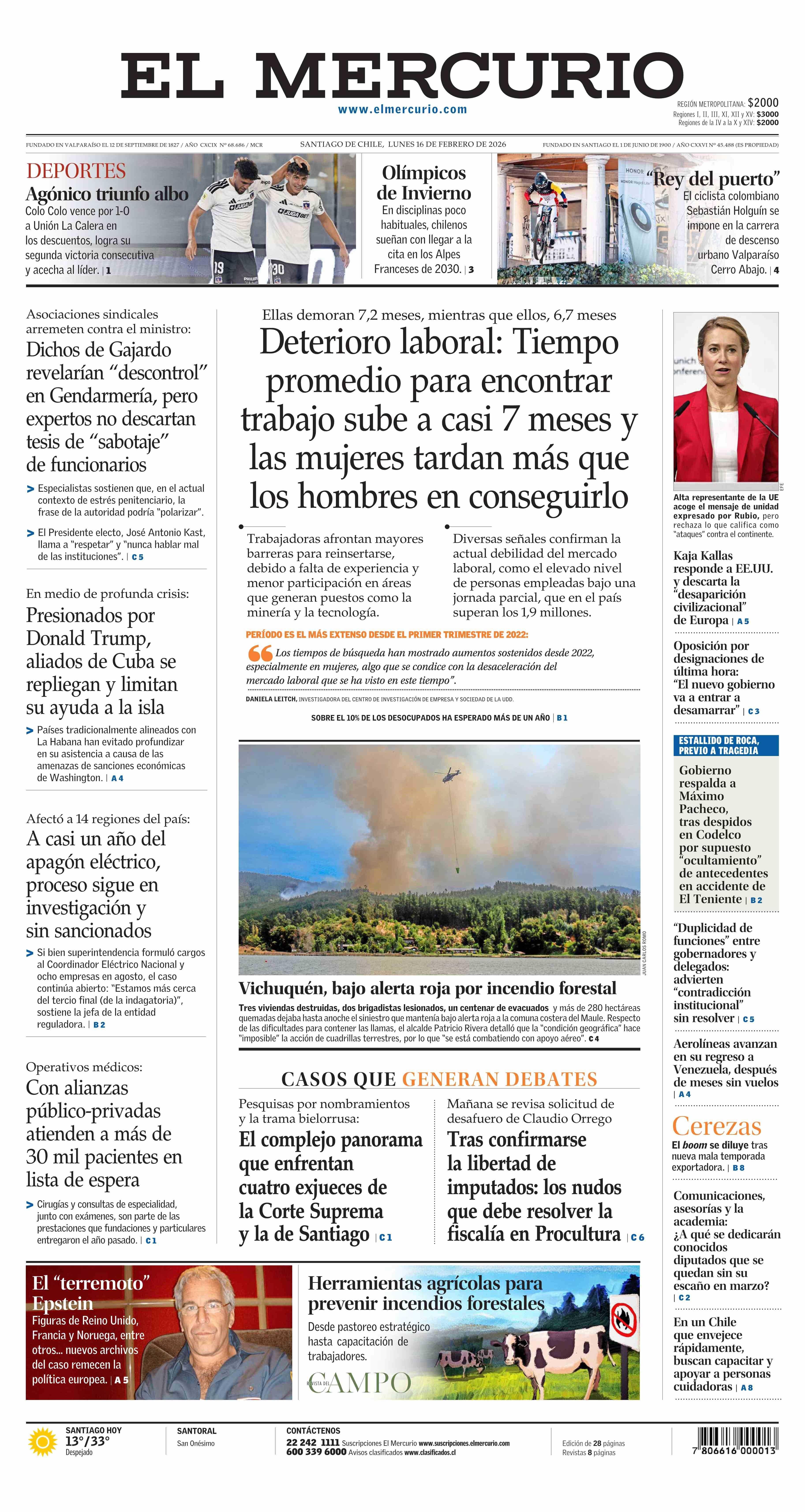 PORTADA EL MERCURIO (A) CHILE 16-02-2026 El Mercurio |