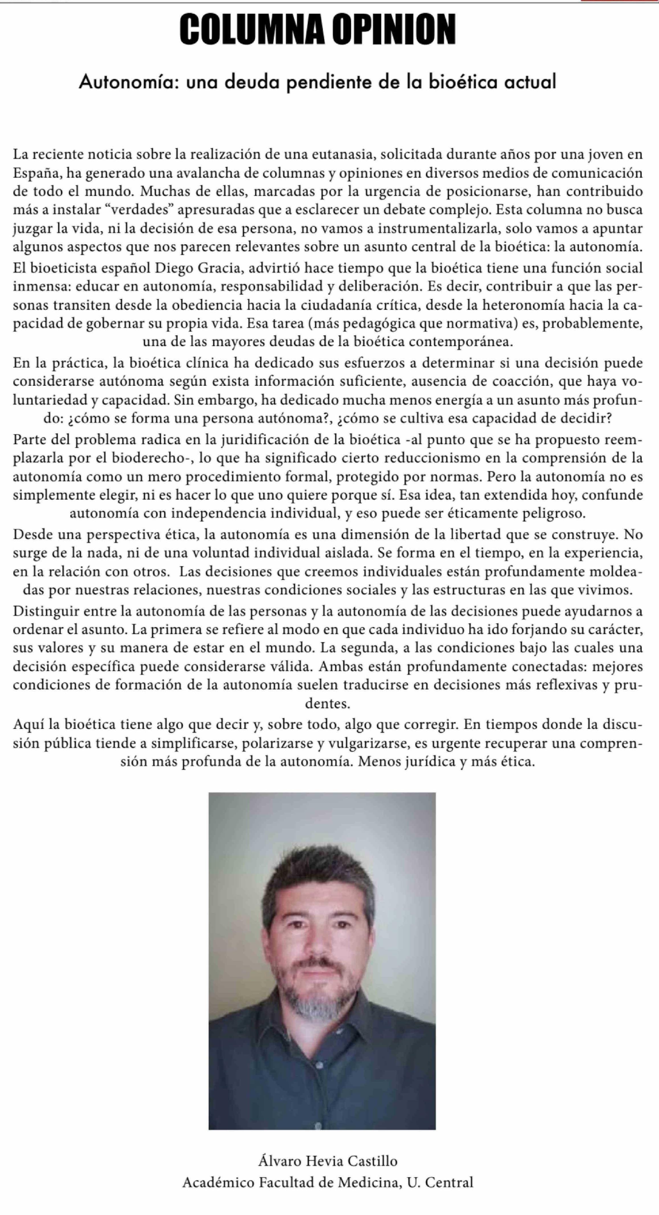 Columnas de Opinión: Autonomía: una deuda pendiente de la bioética actual 15-04-2026 El Lector |