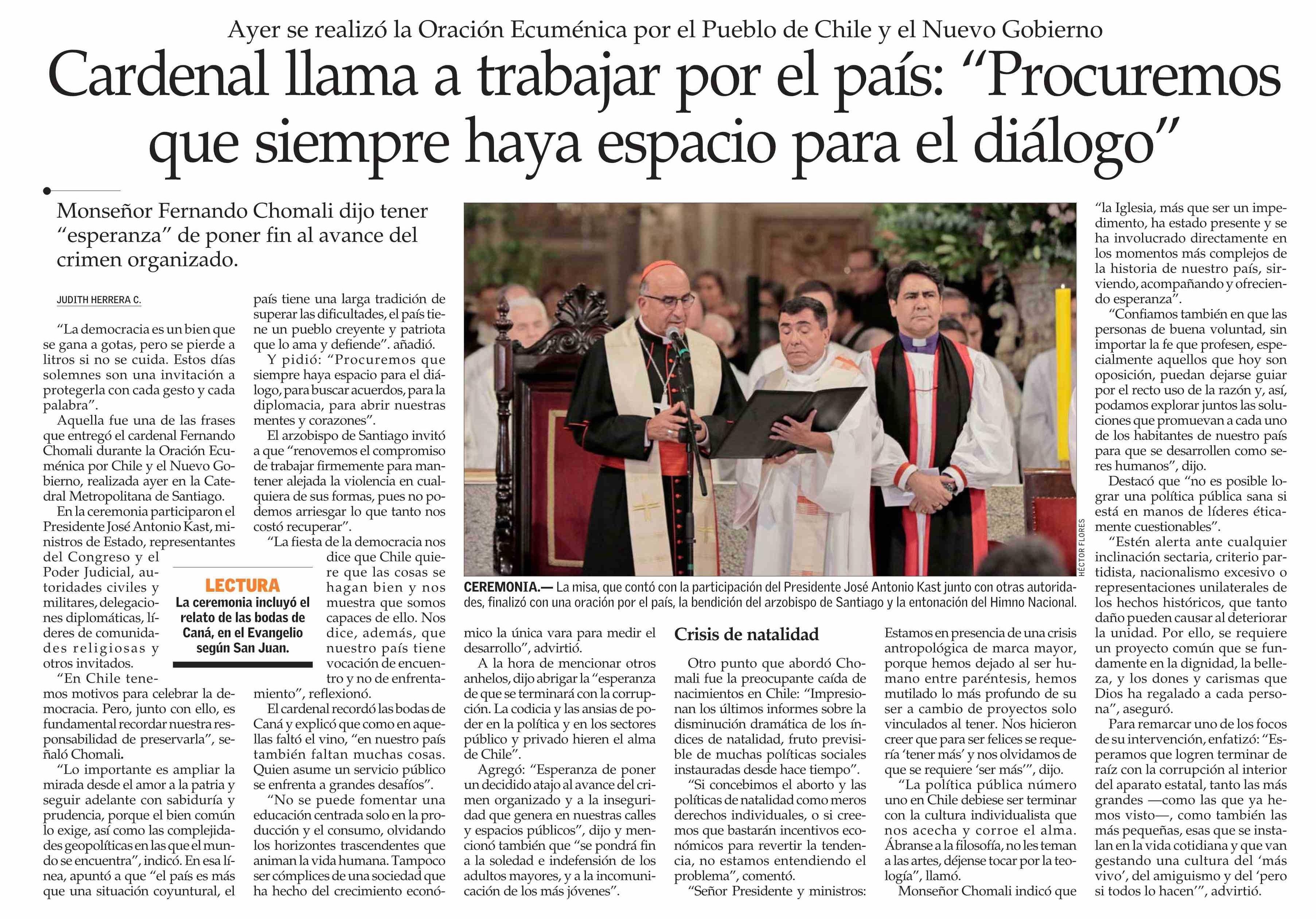 Cardenal llama a trabajar por el país: “Procuremos que siempre haya espacio para el diálogo” 13-03-2026 El Mercurio |