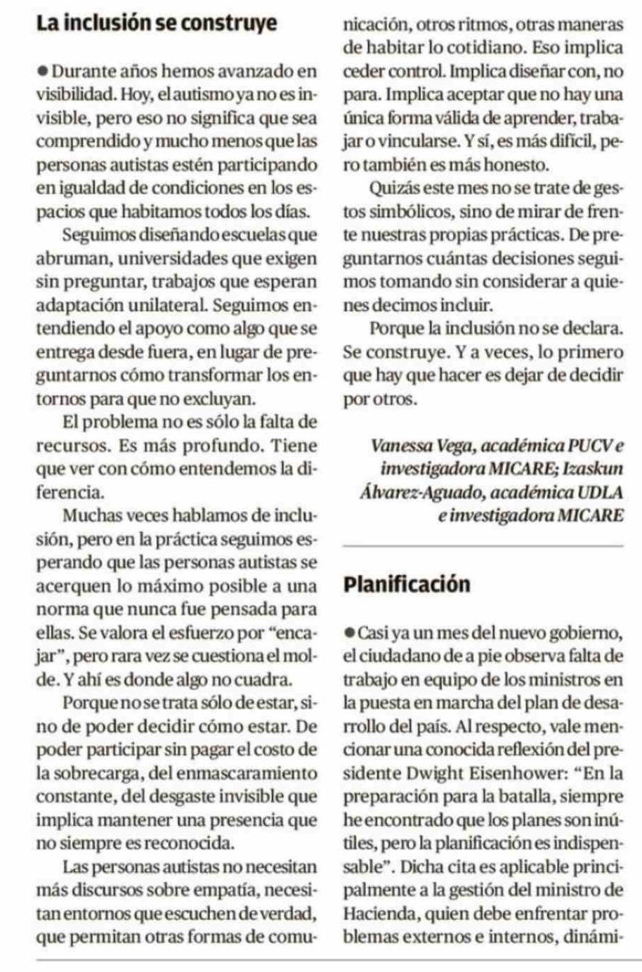 CARTAS: La inclusión se construye visible, pero eso no significa que sea 05-04-2026 El Mercurio de Valparaíso |